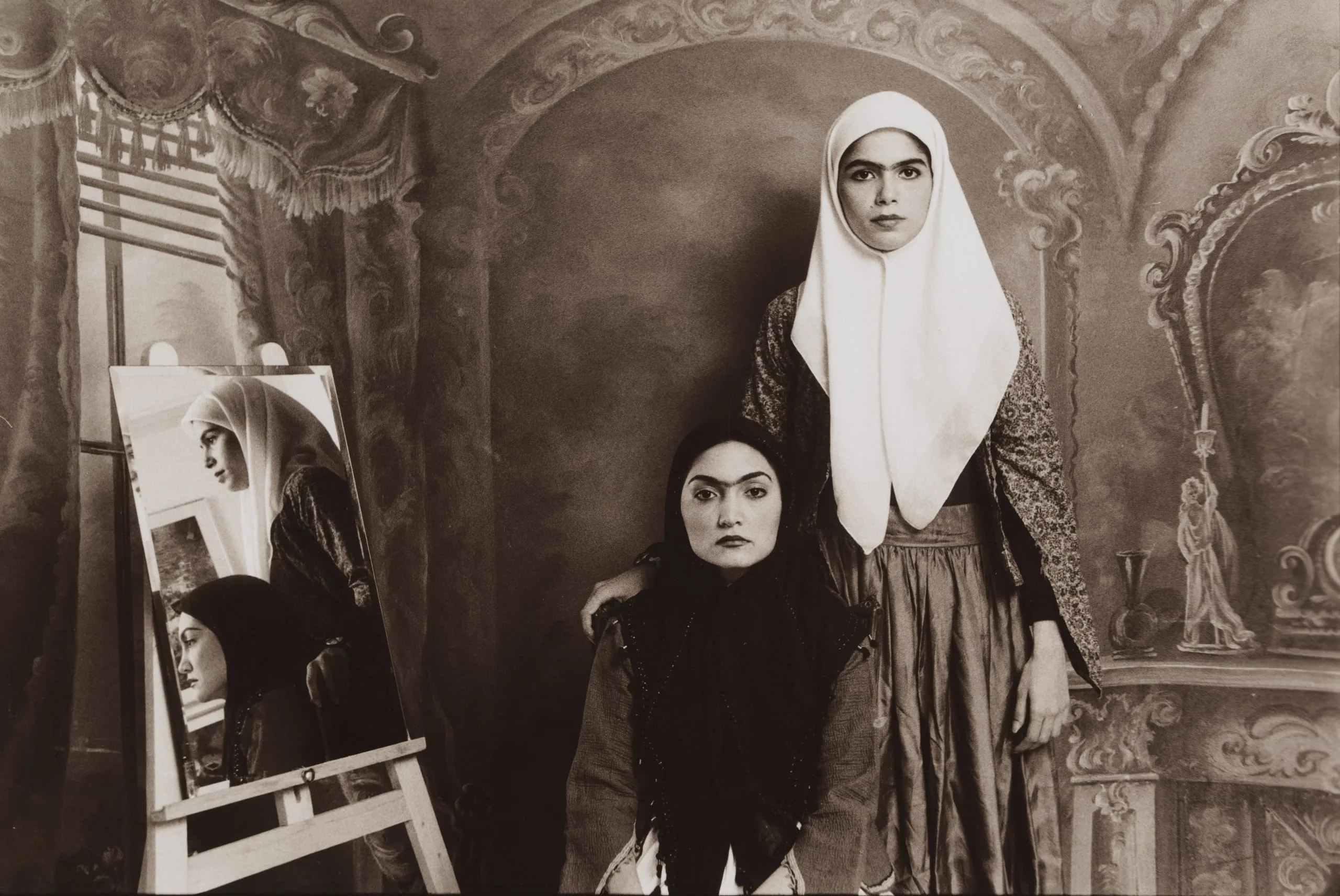 This photograph is from a series of thirty-three portraits by Shadi Ghadirian, a contemporary artist who was inspired by the studio portraiture first introduced to Iran in the late nineteenth century under the Qajar dynasty (1794–1925). In order to re-create the earlier setting, Ghadirian employs painted backdrops and dresses her models in vintage clothes to emulate the fashion of the day: headscarves and short skirts worn over baggy trousers, as well as thick, black eyebrows. She adds modern elements to these traditional scenes, such as a Pepsi can, a boom box, a bicycle and an avant-garde Tehran newspaper. She has said of her work, "My pictures became a mirror reflecting how I felt: we are stuck between tradition and modernity."