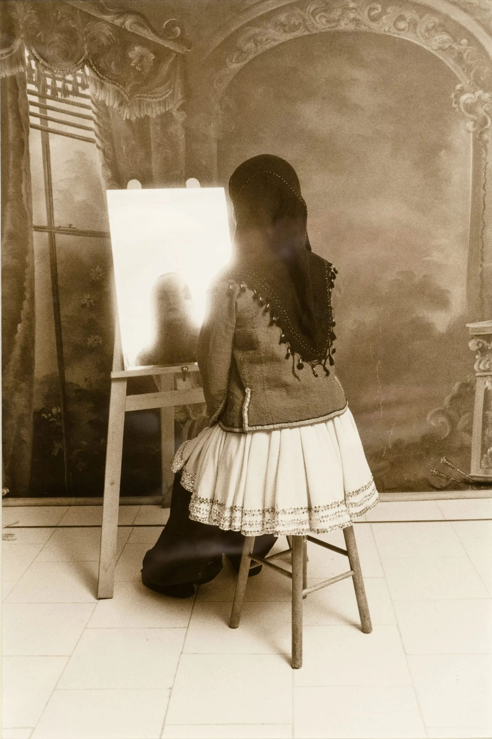 Sepia-toned photograph of a young woman seen from behind, seated on a wooden stool at a canvas easel, wearing a fringed jacket and embroidered skirt, against a painted studio backdrop