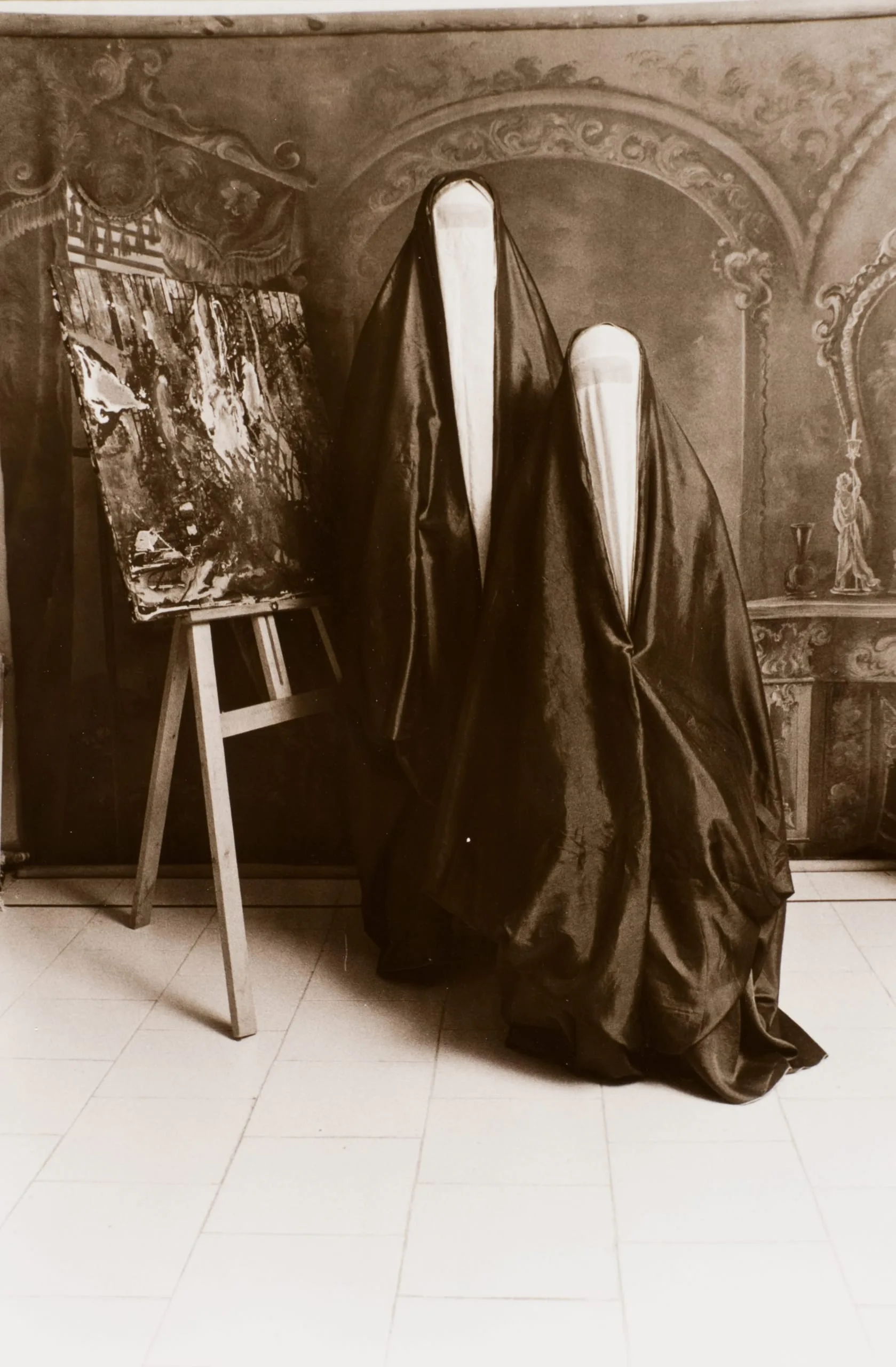 Sepia-toned photograph of two figures fully concealed under a large dark fabric in an artist's studio, with an easel and painted backdrop