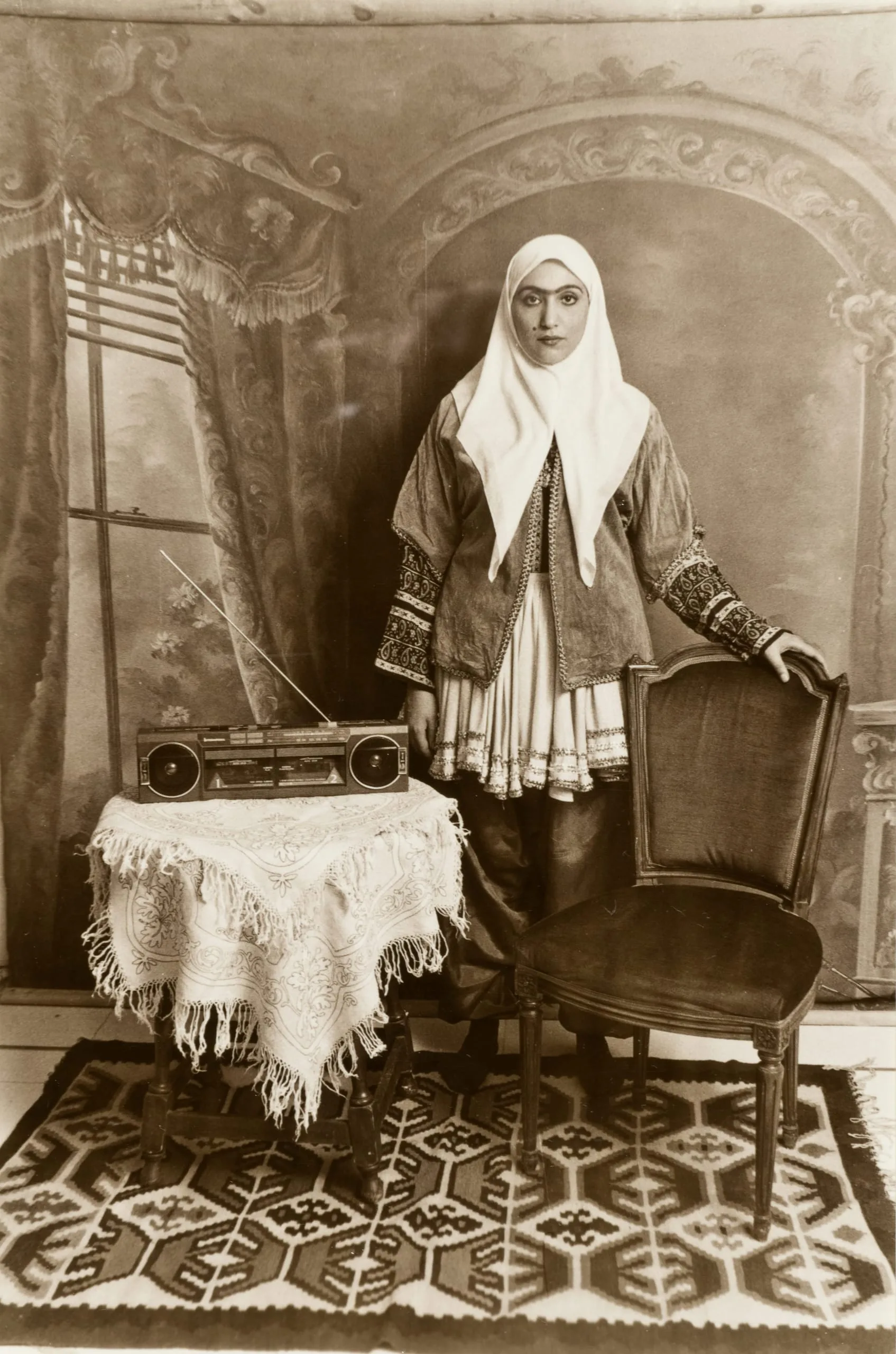 Sepia-toned full-length studio portrait photograph, woman in embroidered jacket, white hijab, and tiered skirt standing beside a chair, with a boombox on a lace-draped table