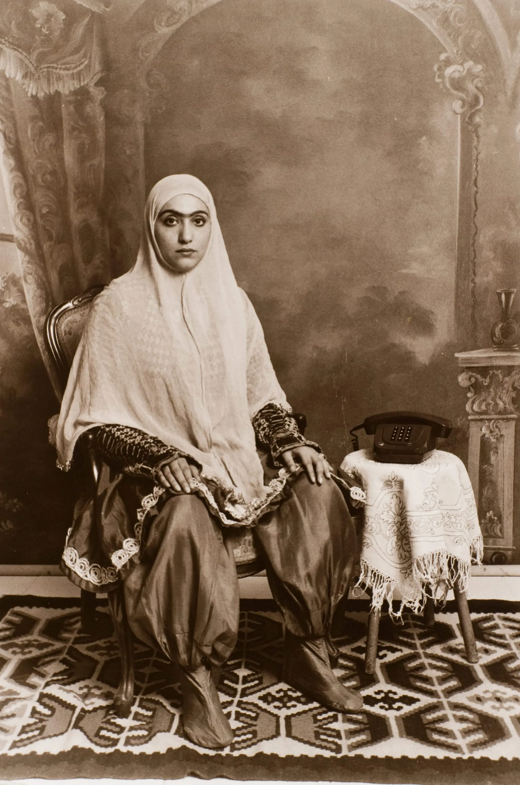Sepia-toned studio portrait photograph, full-length seated woman in white headscarf and embroidered cuffs, with a rotary telephone on a stool to her right