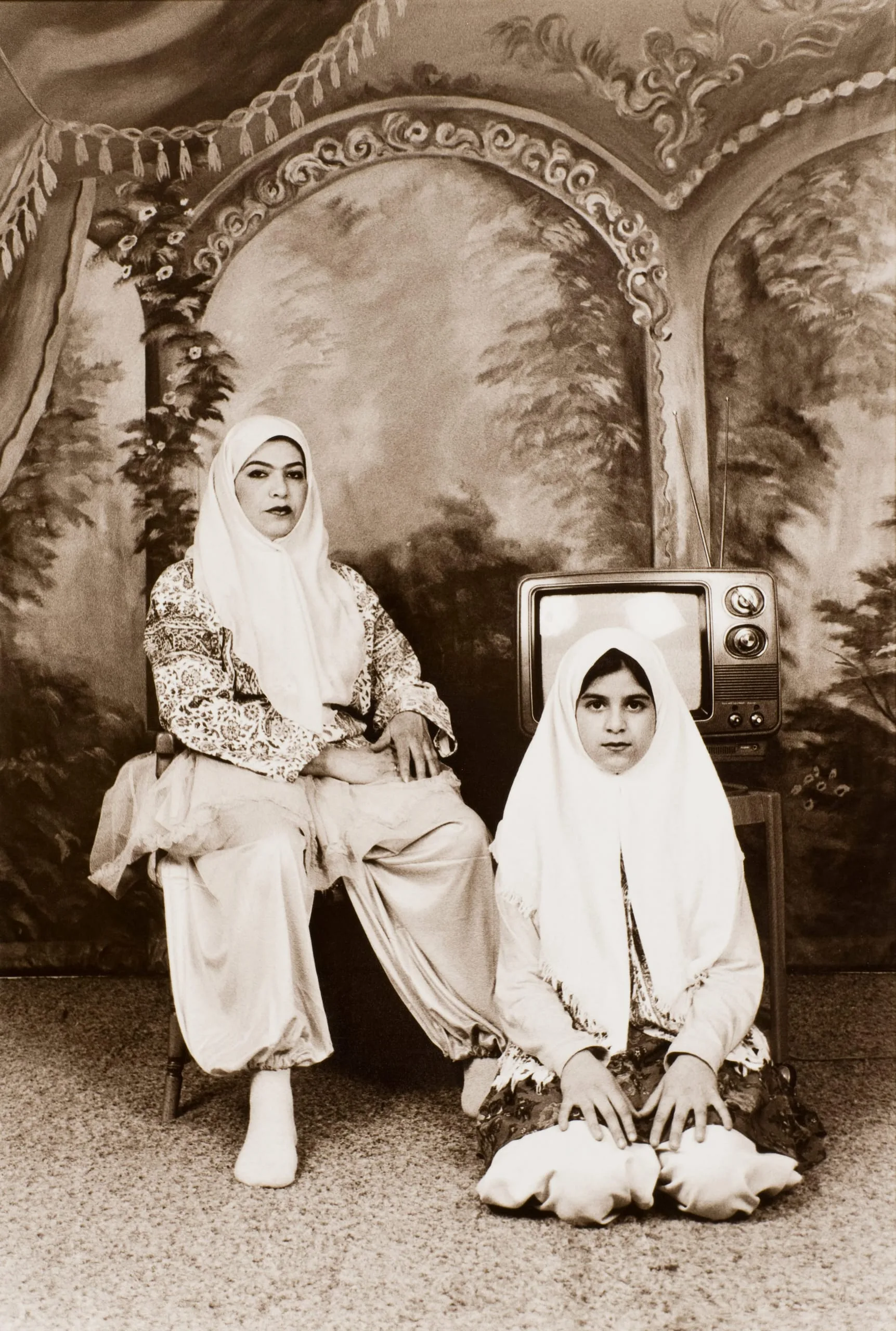 Sepia-toned studio portrait photograph of two females in white hijabs posed before a painted garden backdrop, with a vintage television set between them