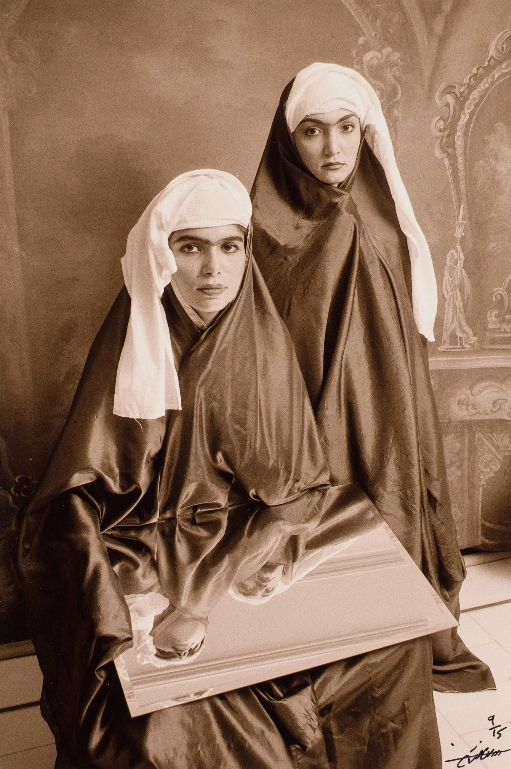 Sepia-toned photograph of two women in dark glossy chadors with white head coverings, one holding a large flat portfolio, posed against a painted studio backdrop