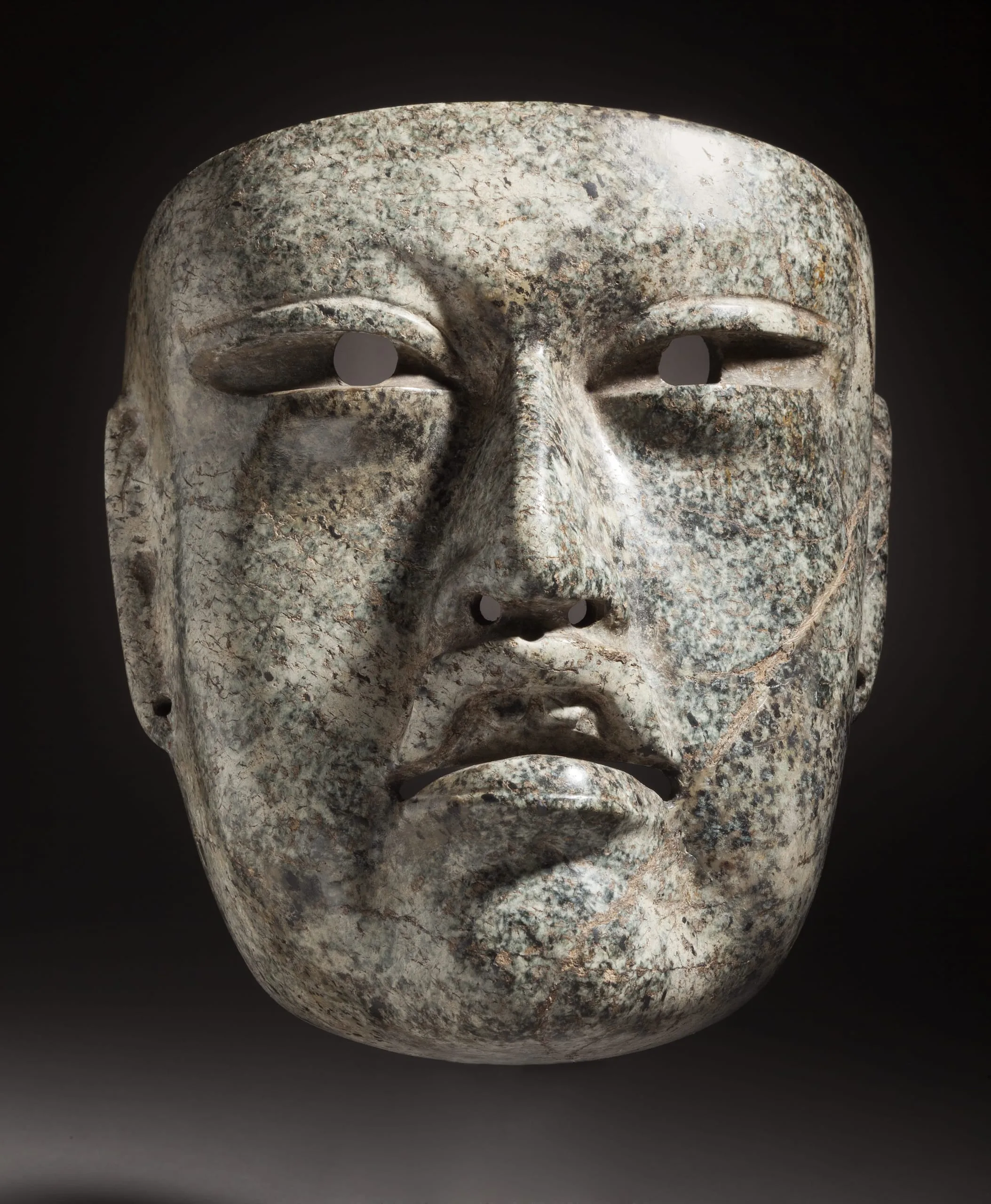 Stone mask carved from mottled green and gray rock, depicting a broad human face with heavy-lidded eyes, wide nose, and full lips, viewed straight on
