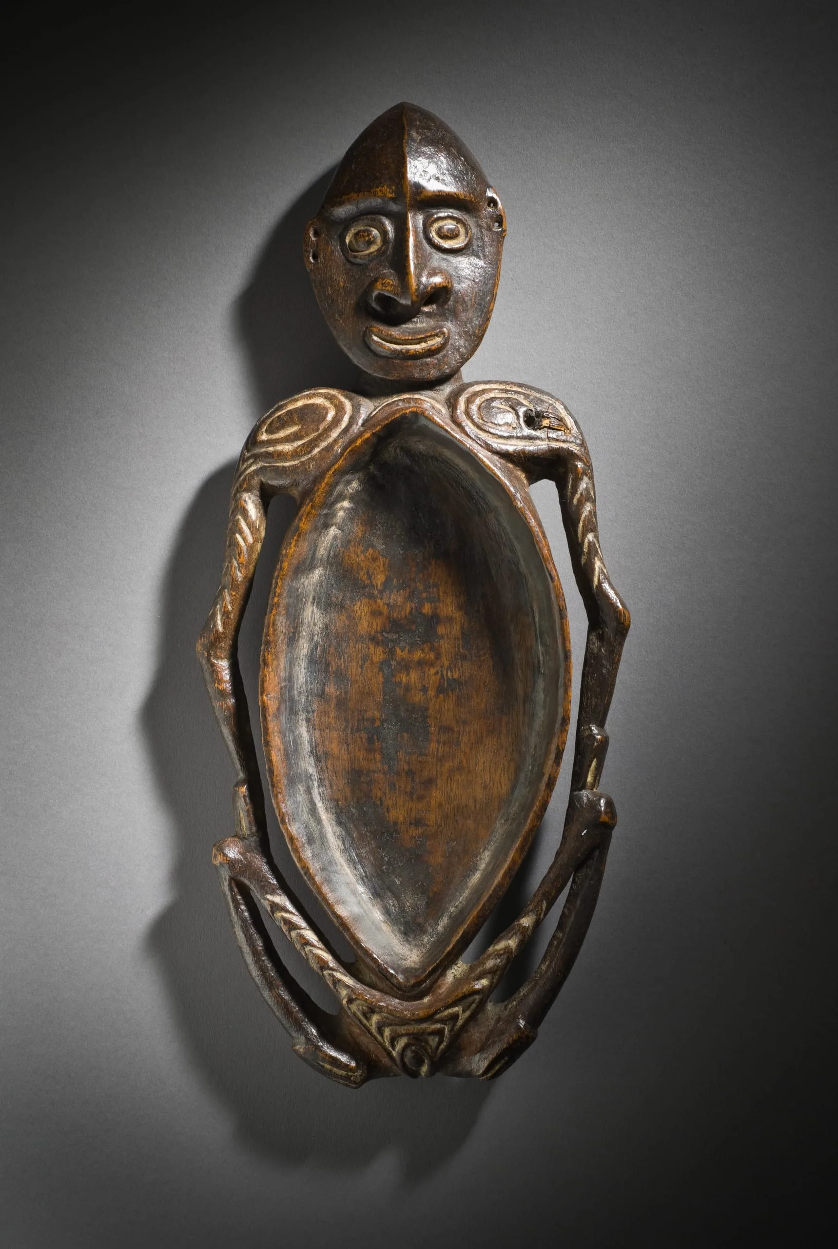 This dish was used to mix pigments for ceremonial body paints common in the Middle Sepik River region. These paints were used to make designs on the body that pertain to certain rituals that often included the honoring of ancestors. Most pigment dishes were in animal forms, different birds, fish, or crocodiles found in the region; however, this example is of a crouching female figure. The carving is smoothly done for the figure, while the back has asymmetrical curvilinear relief carvings that are visible when the dish is not in use.