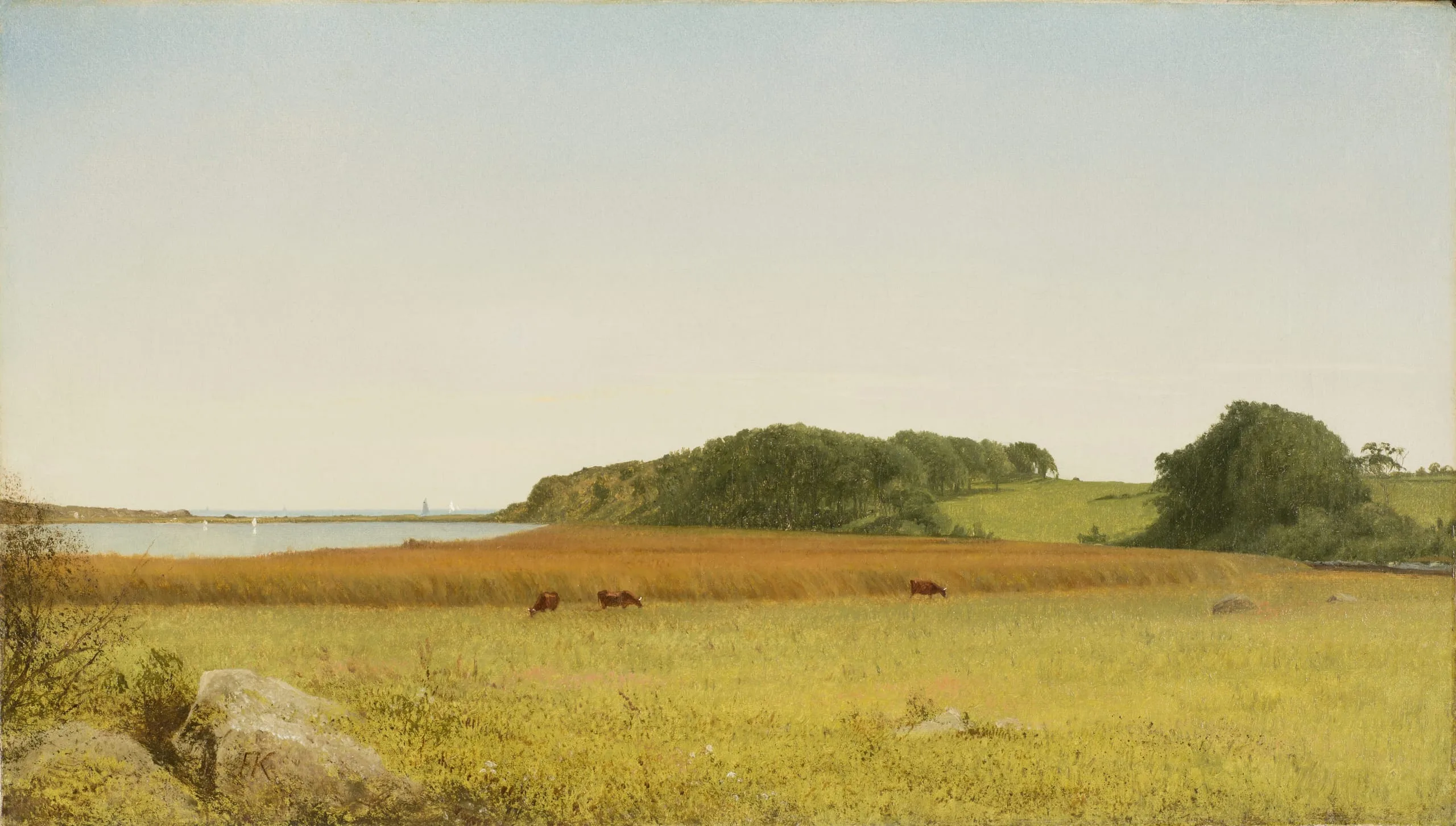 In the museum’s painting Kensett viewed the pond, which once was an inlet of the Rhode Island Sound, looking toward the nearby sound, indicated by the large sailboats in the distance. The topography well suited Kensett’s temperament for serene, open landscapes. The museum’s painting typifies the artist’s mature luminist images of the 1860s. It is a tranquil view of nature on a sunny day with a clear, almost cloudless sky dominating the horizontal composition. Little activity occurs. The cattle grazing do not disturb the harmony of the composition, allowing the viewer to attain a transcendental unity with nature; even Kensett’s thin, smooth brushwork keeps from intruding upon the illusion of contact with nature.