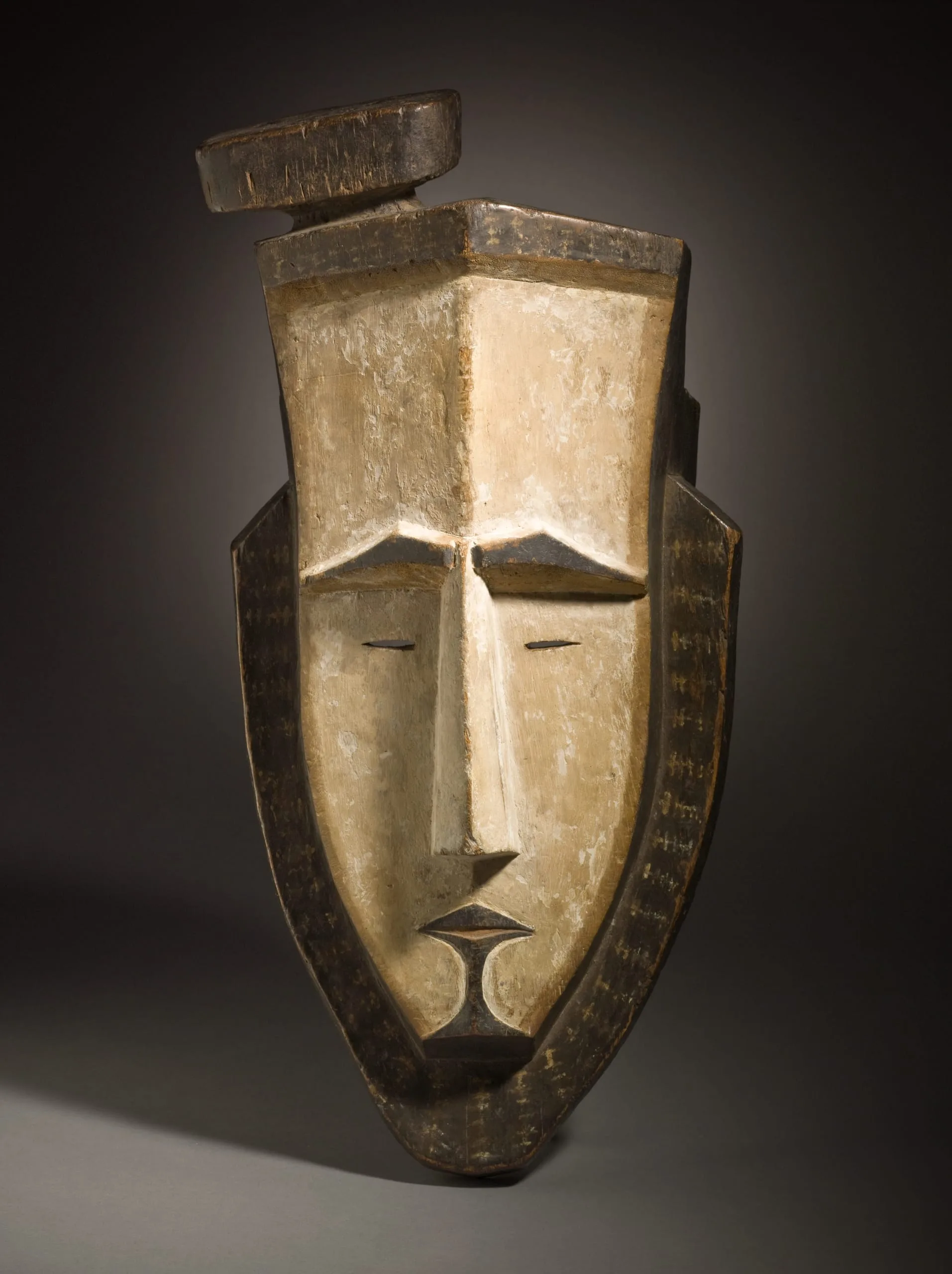 Made by a secret society in charge of protecting ritual procedure, tapuanu, or spirit or ghost, masks have straight noses, thin slit eyes, pursed mouths, and curved eyebrows in a birdlike motif (which also is seen on canoes). The top-knot hairstyle to one side is the only break of symmetry on this mask. These wall masks probably were made to ward off dangerous typhoons and should not be confused with outdoor gable masks.
