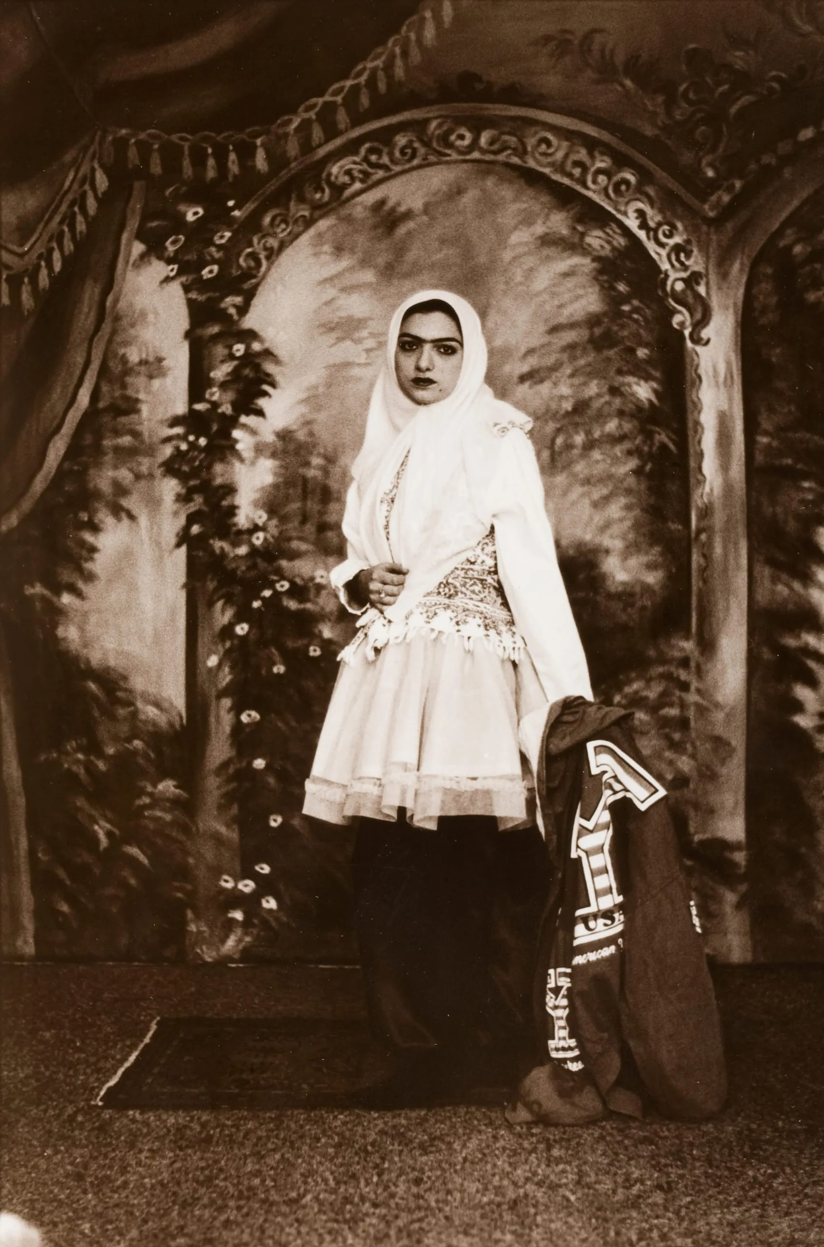 Sepia-toned full-length studio portrait photograph, woman in white headscarf, embroidered belt, and short flared skirt over dark trousers, standing before a painted garden backdrop