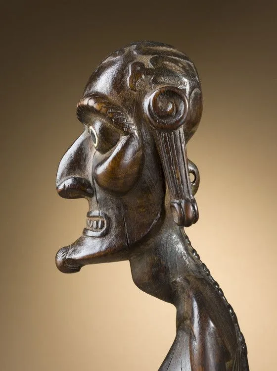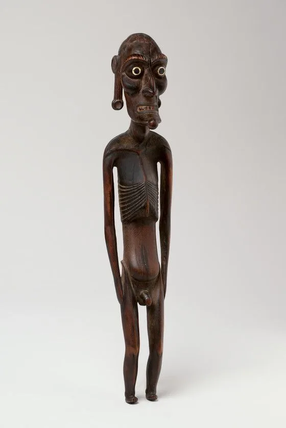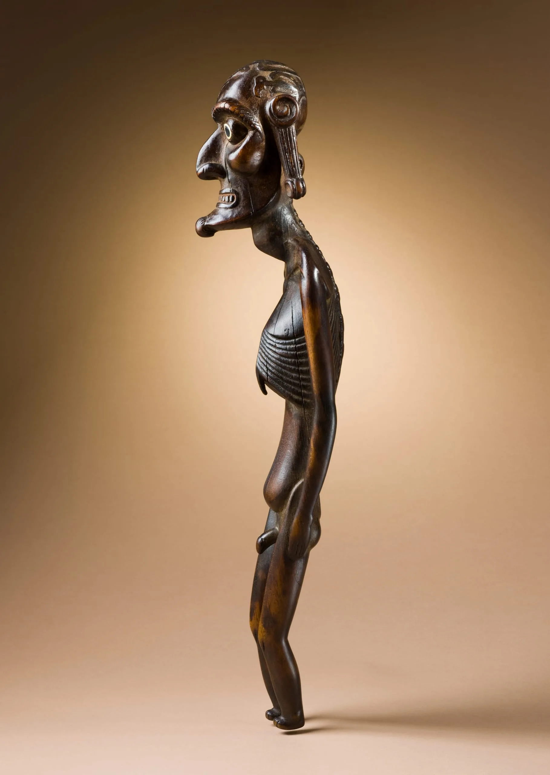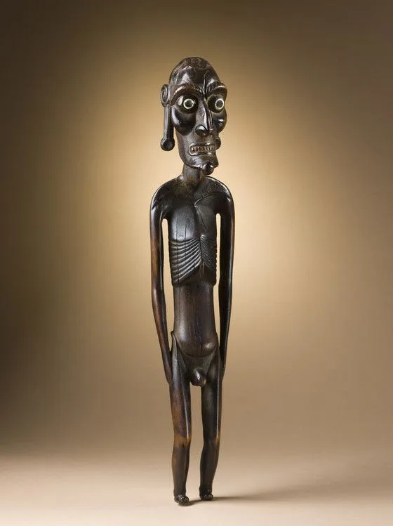 The specific function of the figure is unknown, although there are physical suggestions that it was worn around the neck. Tabs with holes to insert string found at the base of the figure’s neck may have been carved for suspension purposes. It is generally believed through myth stories that these fascinating figures represent the ghostly forms that ancient ancestors took when they appeared before a mythic hero. This hero then returned home to carve the ancestral beings that he had seen.