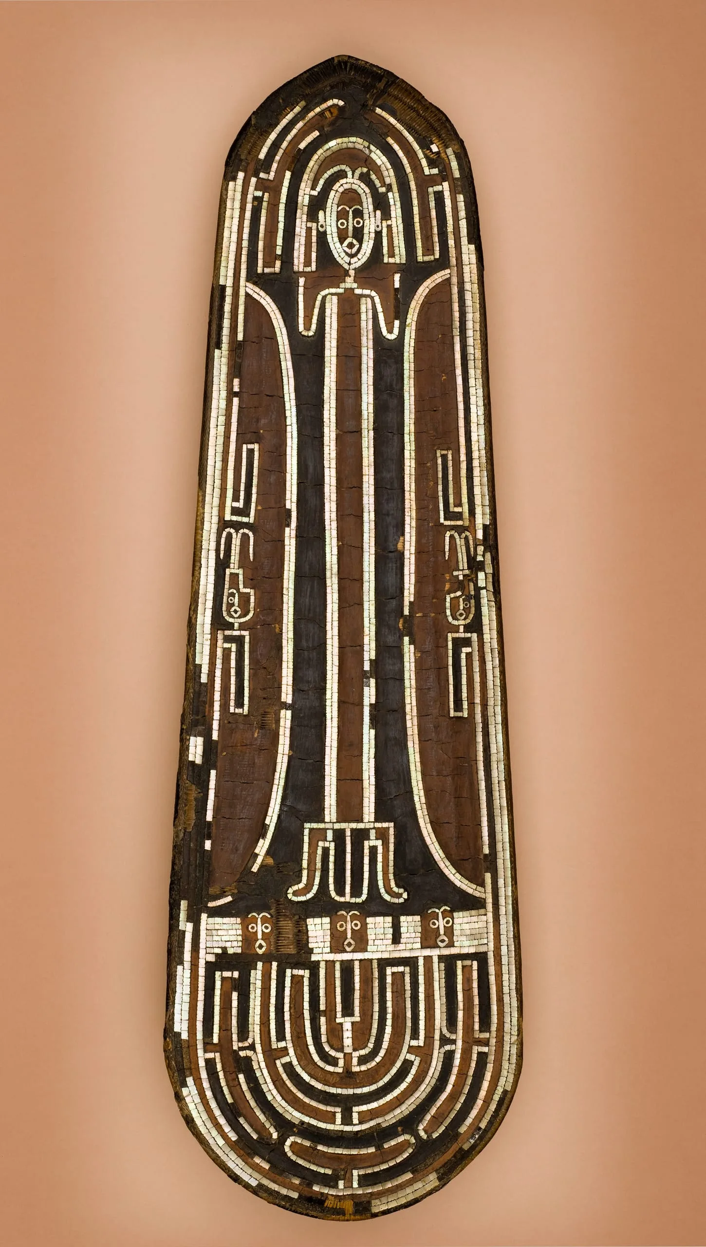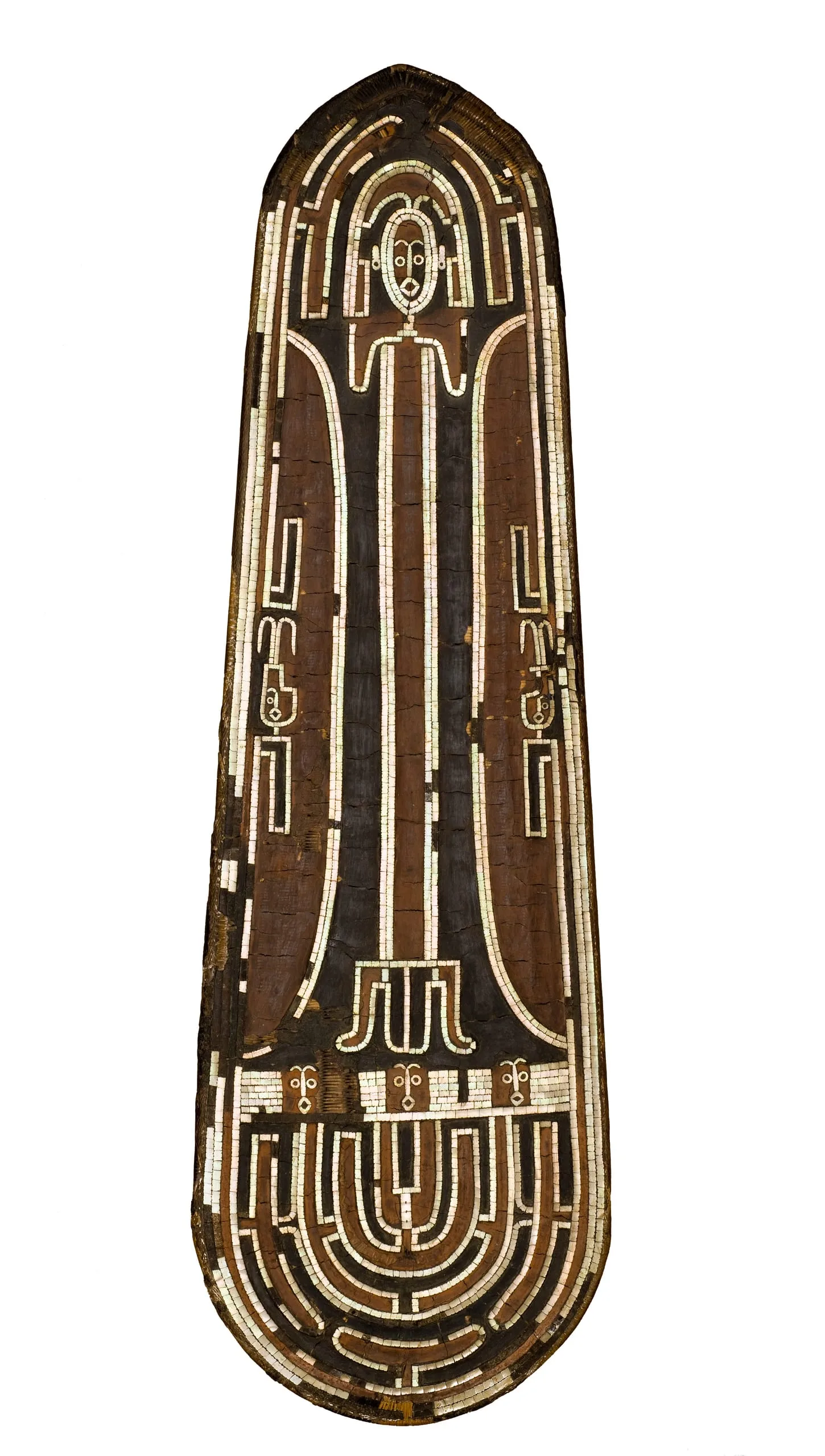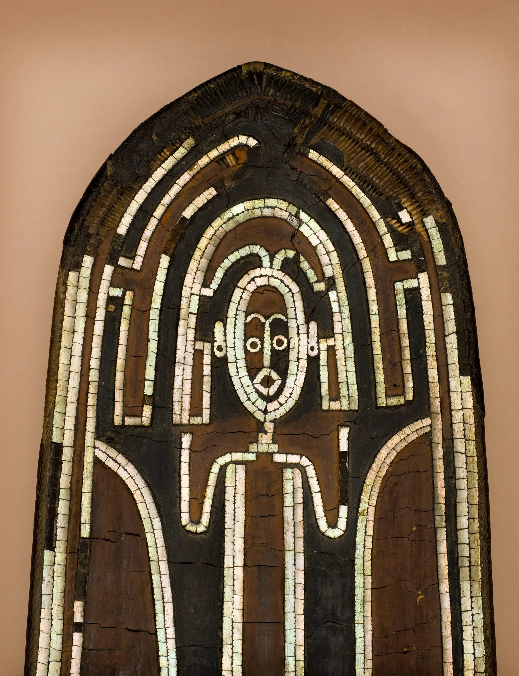 The designs, on a support of coiled fiber in an elongated oval shape, were executed in nautilus shell inlaid into parinarium nut paste. The central elongated standing figure is a rectangular shape, with upraised arms and hands placed near the face. Below this figure are three human heads—a possible reference to cannibalism—and a head in profile on each side of the main figure. The inlay continues with linear bands around the shield’s edge. The meaning of these designs and the use of these types of shields are not known.