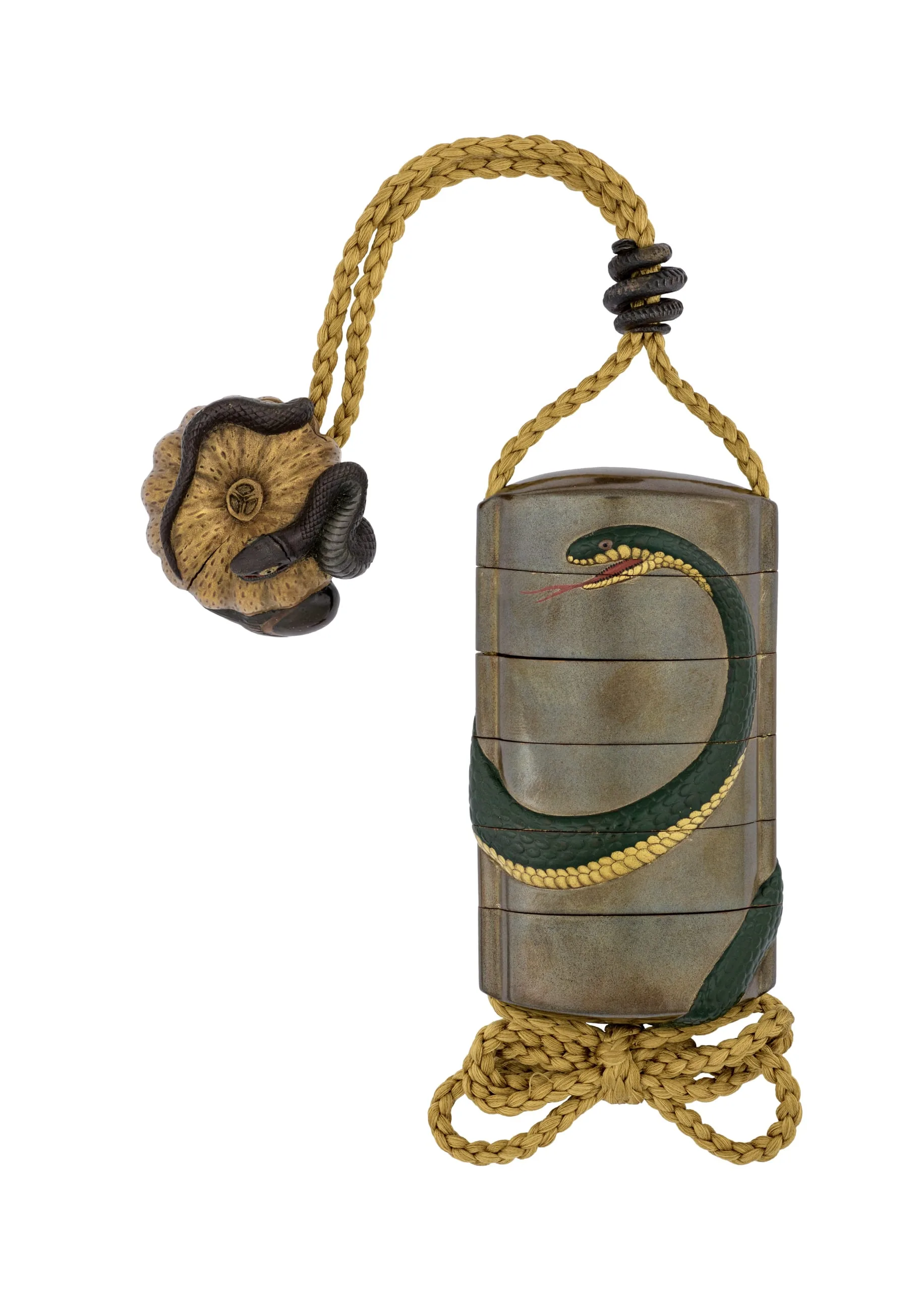 - Inrō: Gold and green takamakie on pewter ground; Ojime: bronze; Netsuke: Wood, gold makie and brown lacquer, polychrome