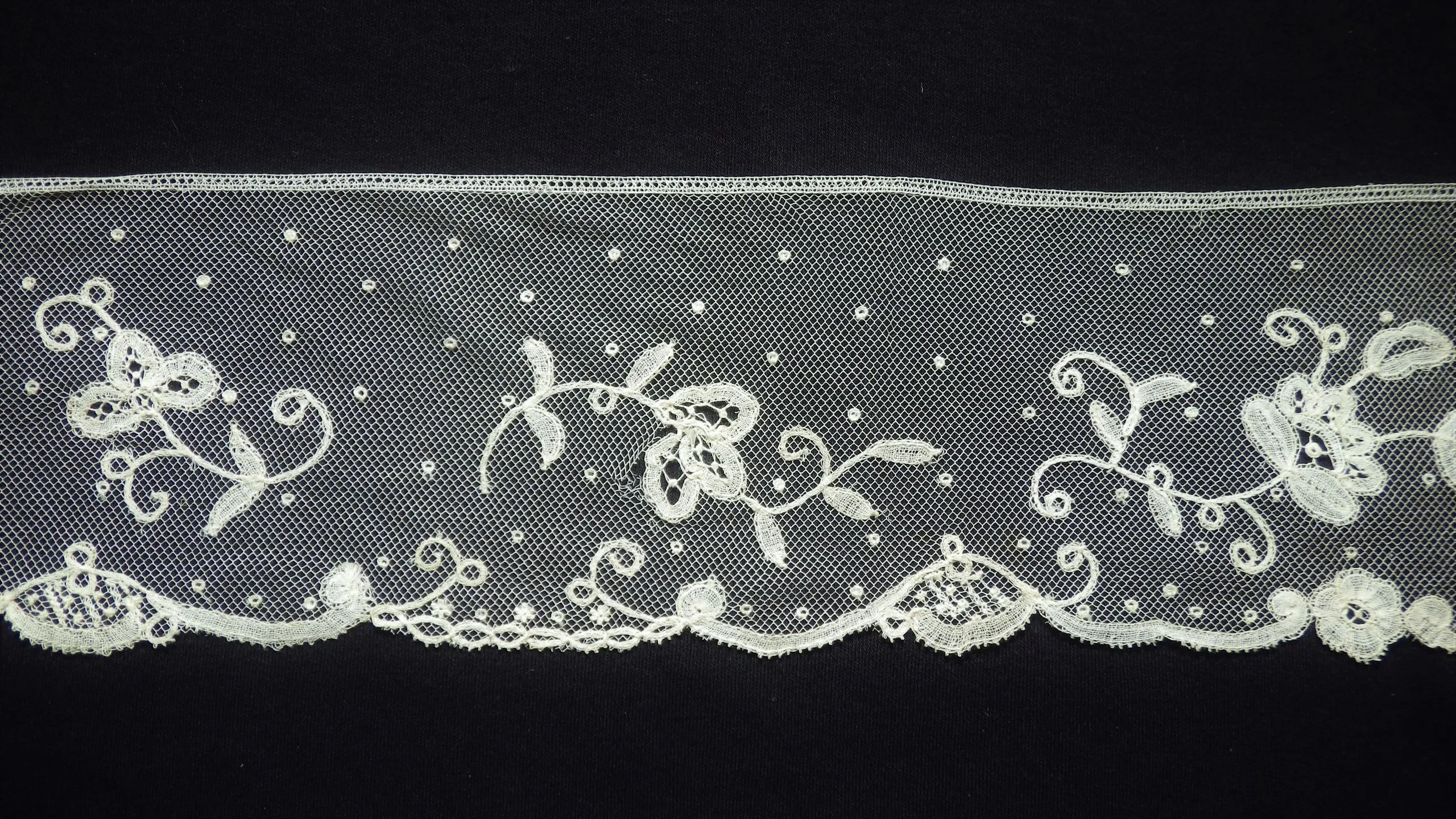 Horizontal strip of ivory needle lace with diamond-mesh ground, scattered raised dots, repeating floral and vine motifs, and a scalloped lower border, against a black background