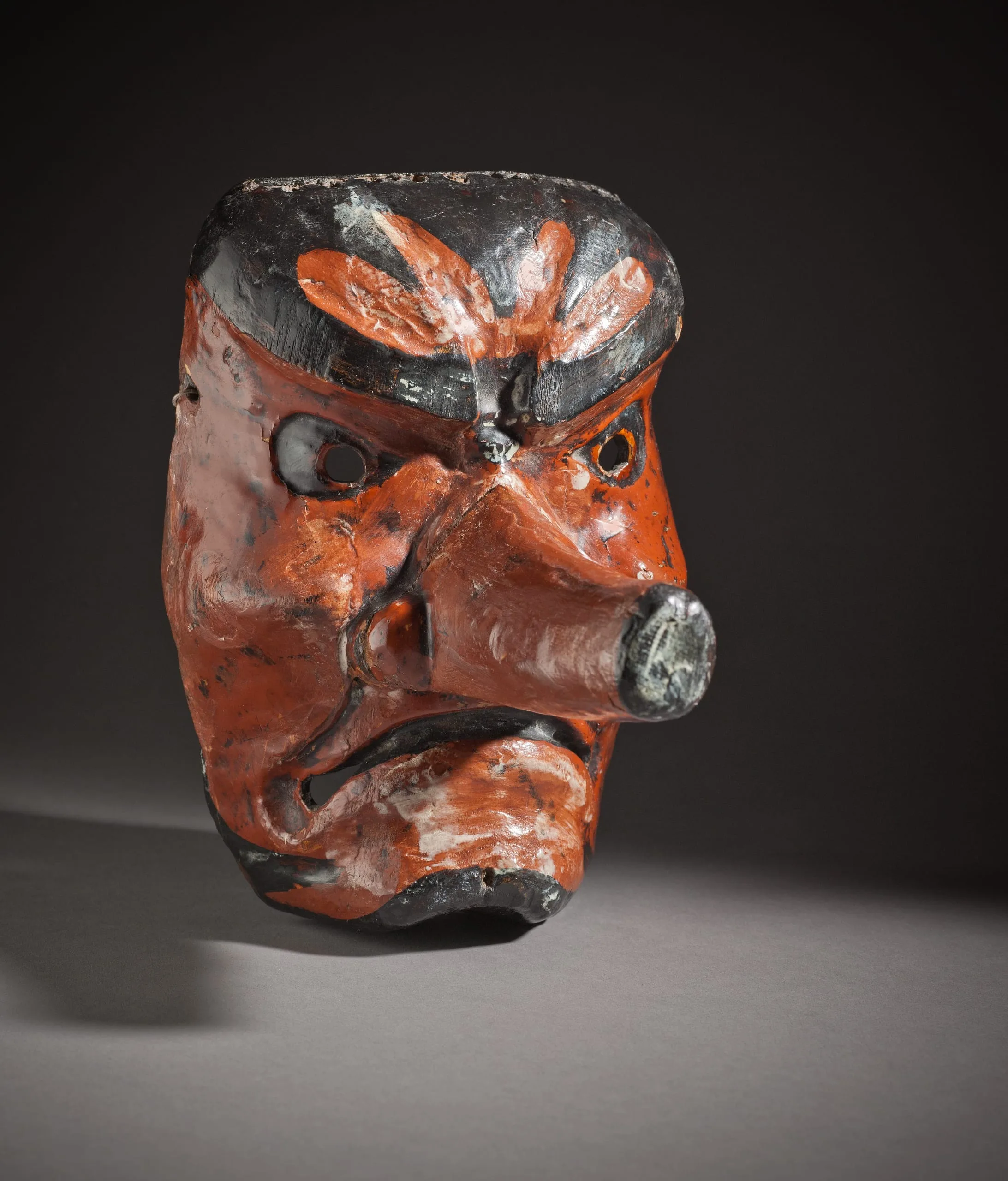 Carved and painted face mask in burnt orange-red and black, with bulbous nose, deep-set oval eye holes, and heavily contoured brow and cheeks