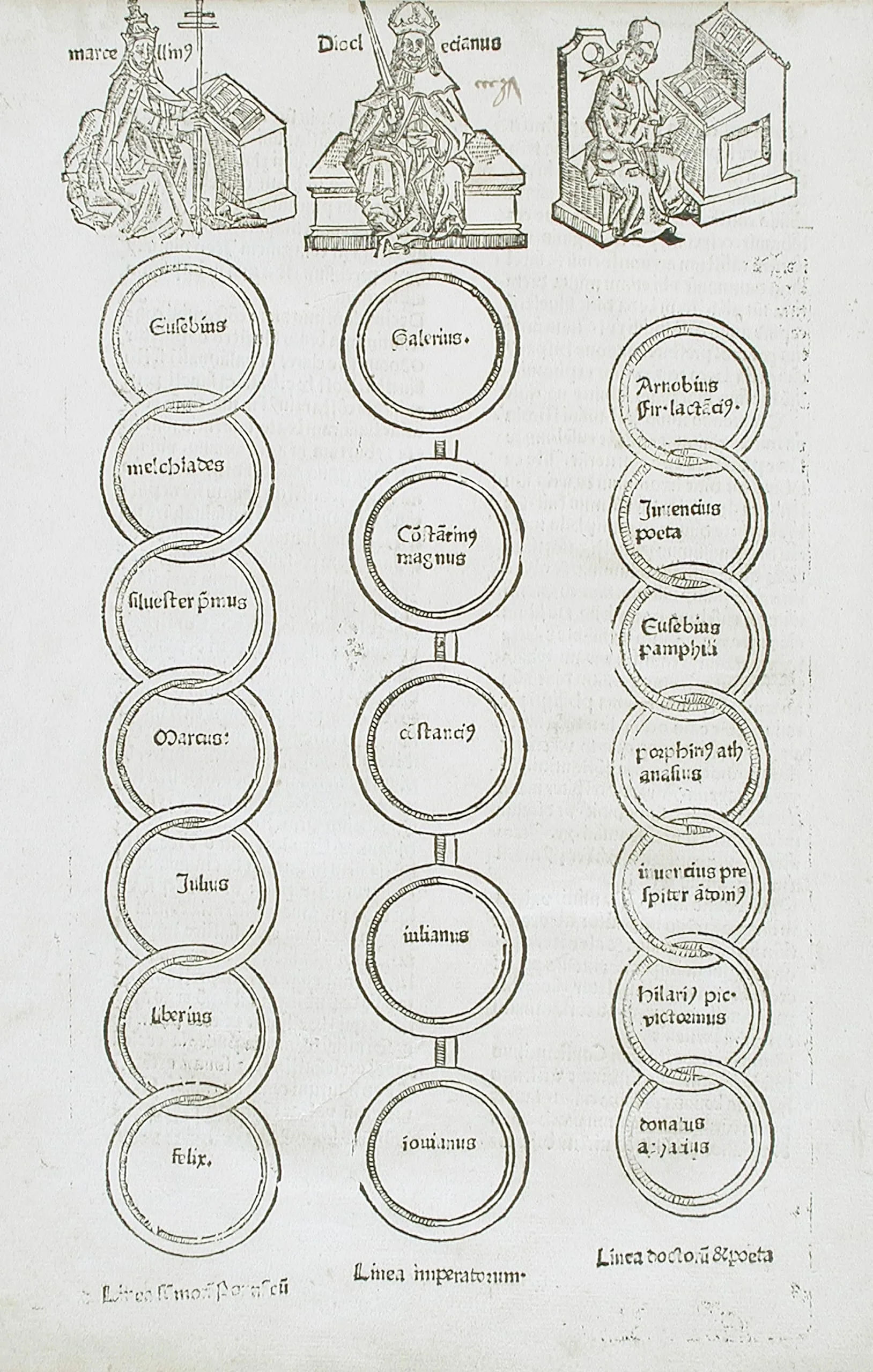 Woodcut print with three vertical chains of interlocking rings containing names in Latin letterpress type, topped by small illustrations of enthroned figures, arranged as genealogical or chronological columns