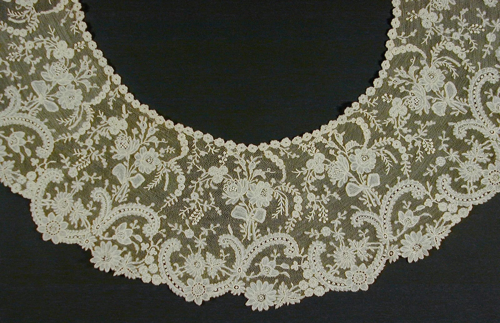 Cream-white lace collar laid flat on a dark background, with allover floral and scrolling motifs on a fine net ground and scalloped outer edge