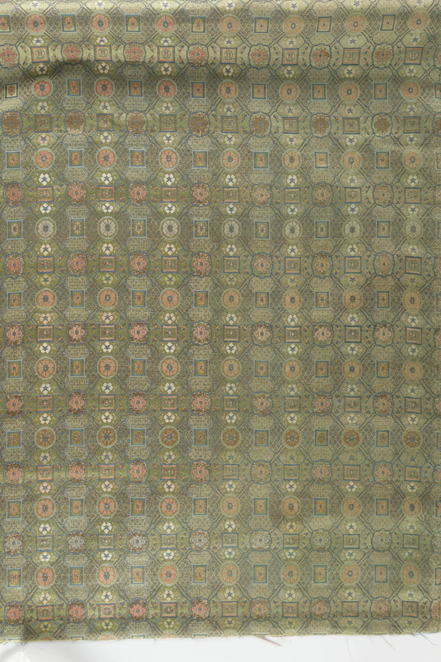 - Silk satin with silk and gilt paper supplementary-weft patterning bound in twill (lampas)