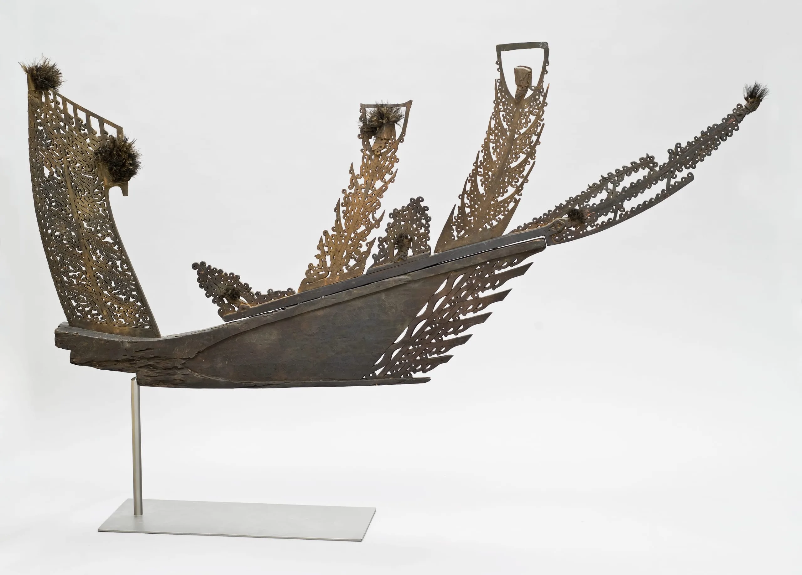 Figures attached to the tops of the prow are ancestor effigies known as korwar, literally translated as “soul of the dead,” which are topped with cassowary feathers. These korwar protected those riding in the canoe.