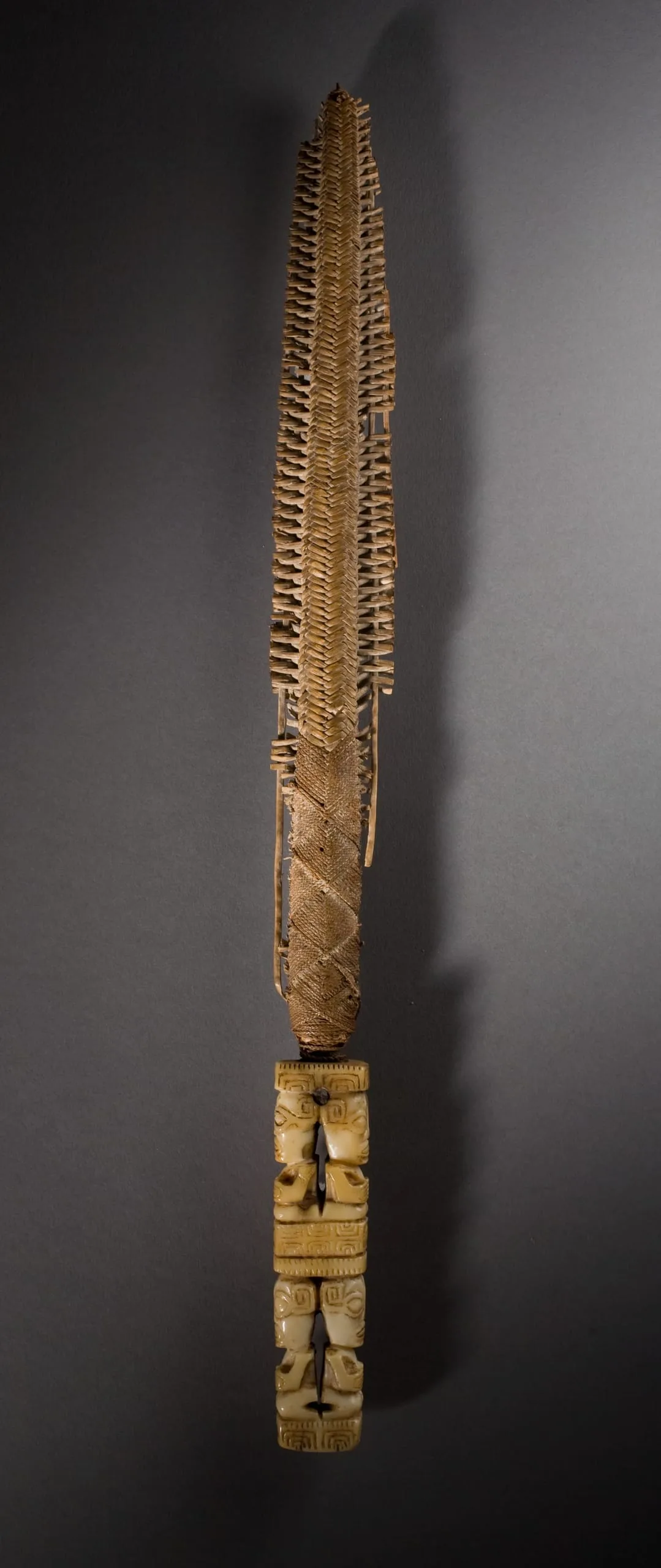 The handle has pairs of tiki figures standing back to back and retains the complex weave of plaited sennit strands originally joining the fan and handle. The fans made in the Marquesas were woven in well-crafted patterns and were straight at the top, which varies from other Polynesian fans that have curved or pointed tops. This straight top was difficult to use in a utilitarian way because it did not move as smoothly through the air as the Polynesian curved-top fans. This nonutilitarian construction shows that Marquesan fans were used as decorative items, to display status through the fine craftsmanship involved in their creation.