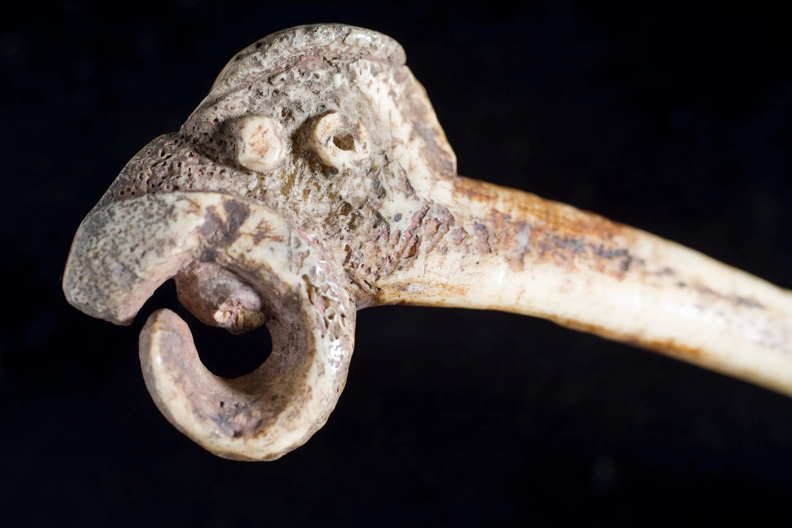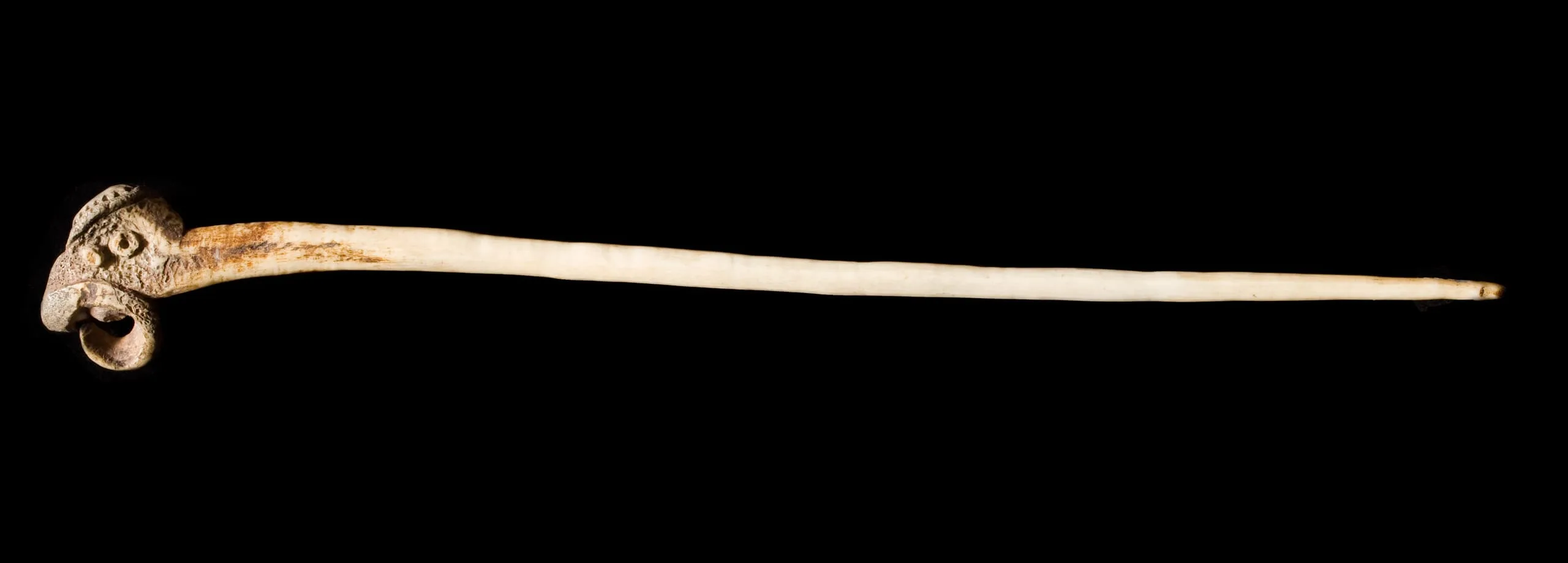 Bone or ivory pin with a long, smooth cream-colored shaft tapering to a point, topped by a small carved animal head with a curling beak or snout