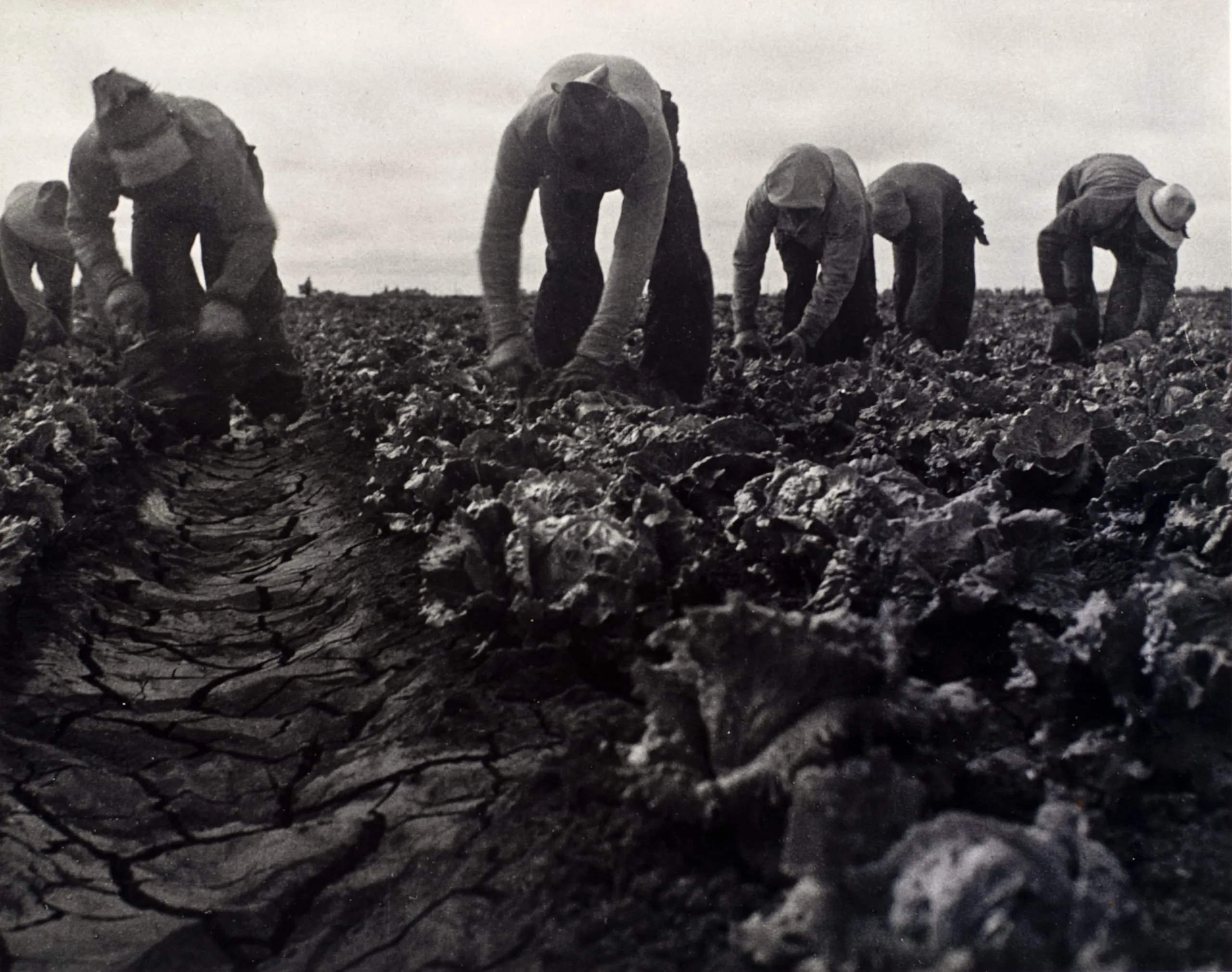 Lettuce pickers are bent over in the fields. The repetition of their bowed forms implies that they are engaged in a shared struggle. No faces meet the viewer's eye, making the situation of the individual less important than the larger context of a group of people working hard to make a living. The low perspective makes the backbreaking labor appear heroic, as the figures shown darkened against a light sky become monumental within the landscape. Dorothea Lange captures the physical pain of the work and the strength of the lettuce pickers through these applications of perspective, form, and contrast.