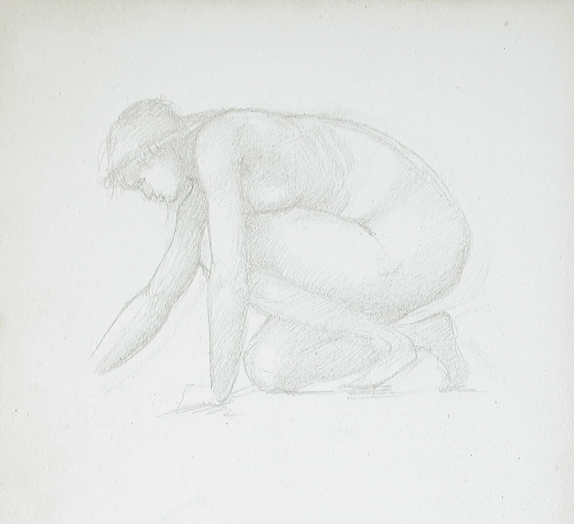 Pencil drawing on off-white paper of a nude figure crouching and leaning forward, arms reaching toward the ground, rendered in soft overlapping strokes