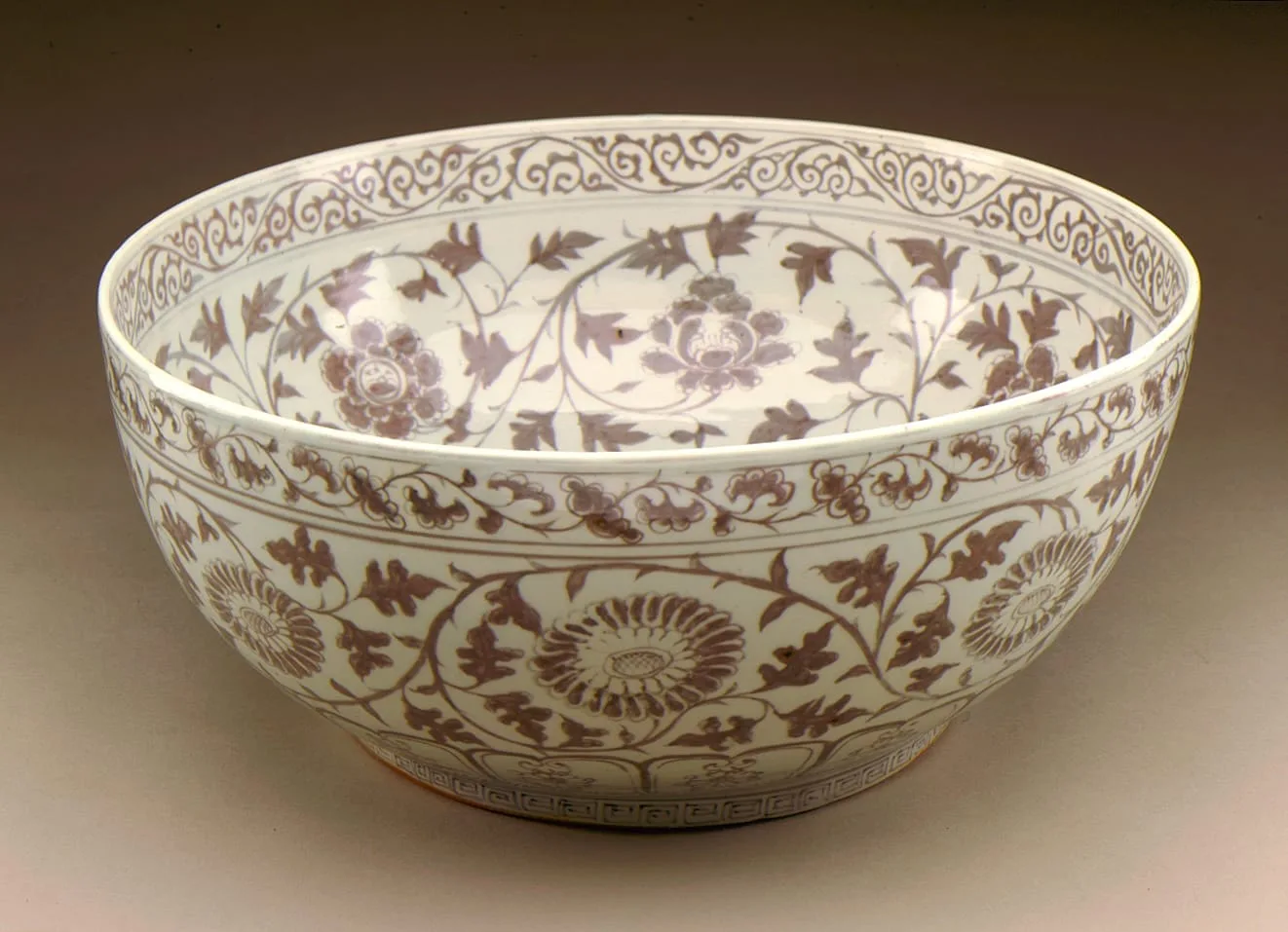 - Wheel-thrown porcelain with red painted decoration under clear glaze