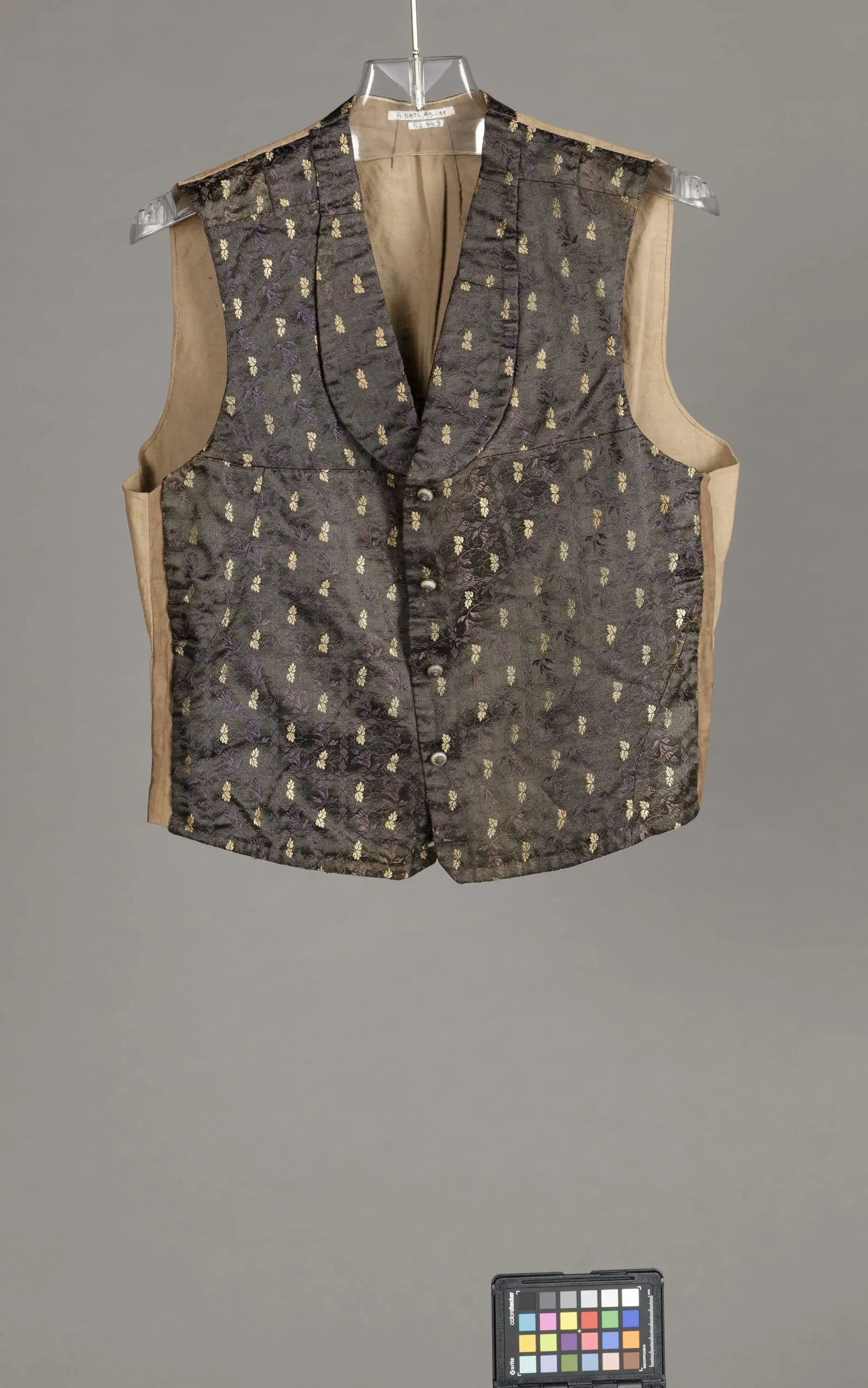 - Silk satin with silk supplementary-weft patterning and mother-of-pearl, metal, and glass buttons