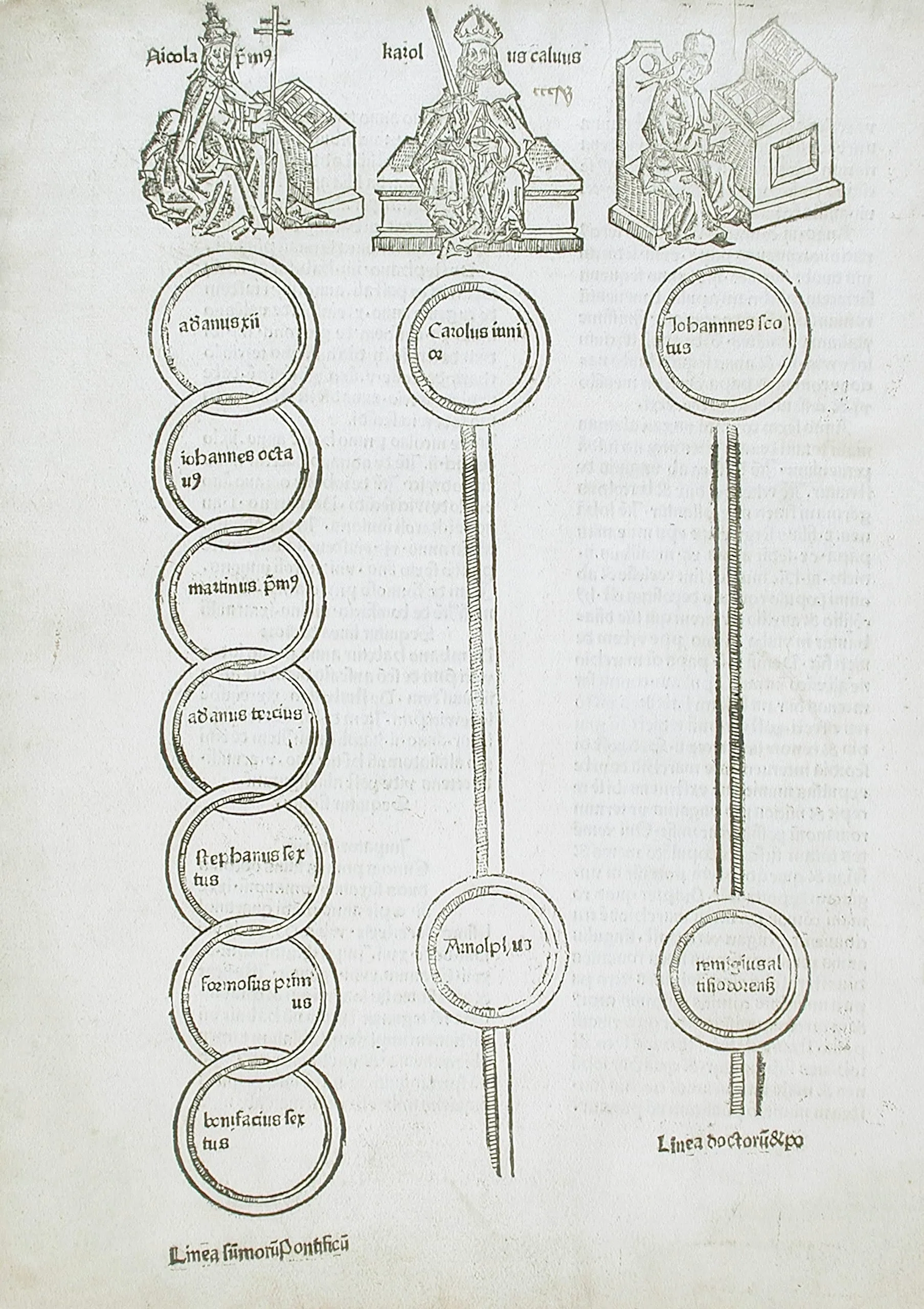 Woodcut print on cream paper showing a three-column genealogical diagram with enthroned figures at top and chains of labeled circles below, with Latin inscriptions throughout