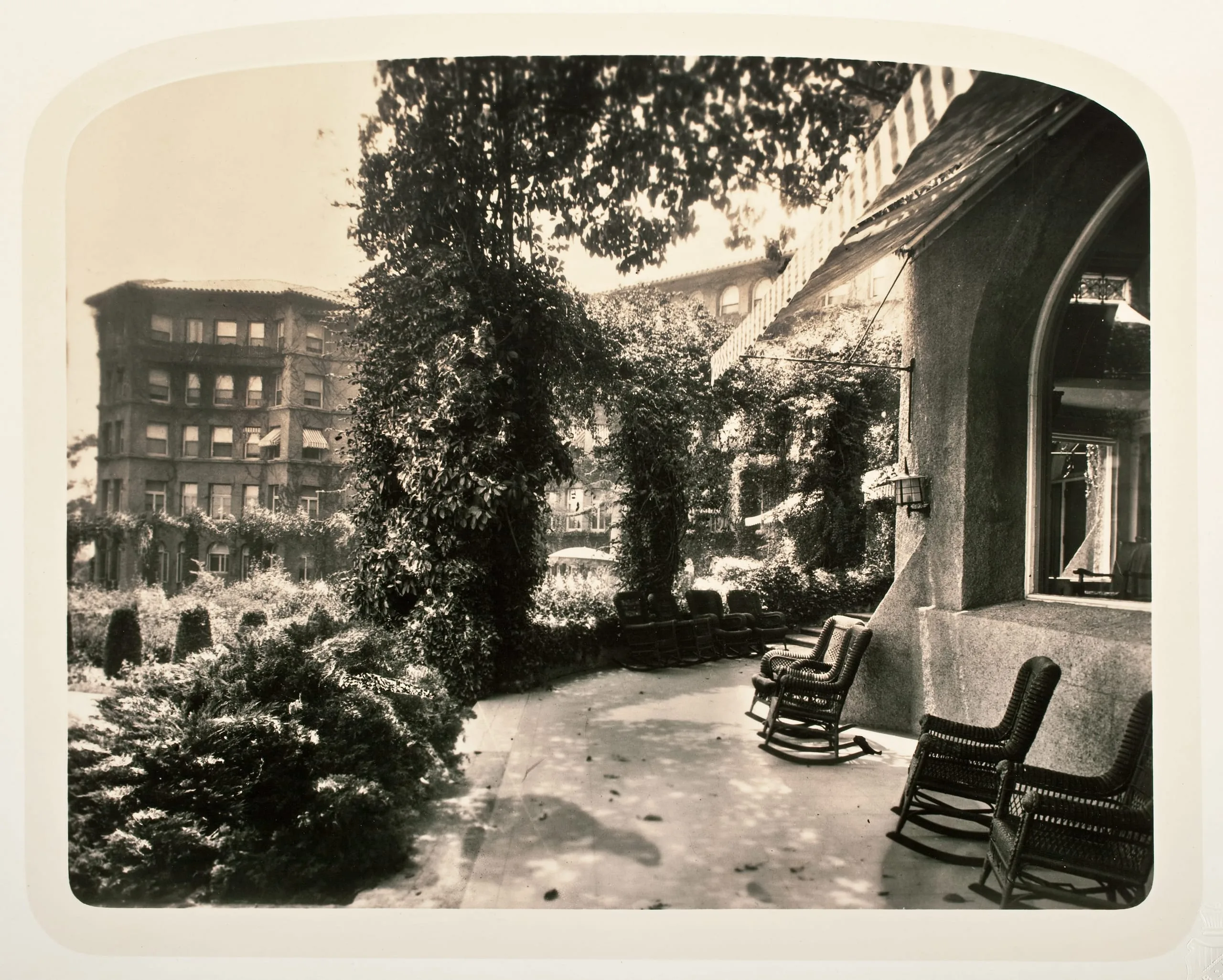 Sepia-toned photograph of a paved terrace with wicker chairs, vine-covered trellises, and a multi-story brick building in the distance, printed with rounded top corners