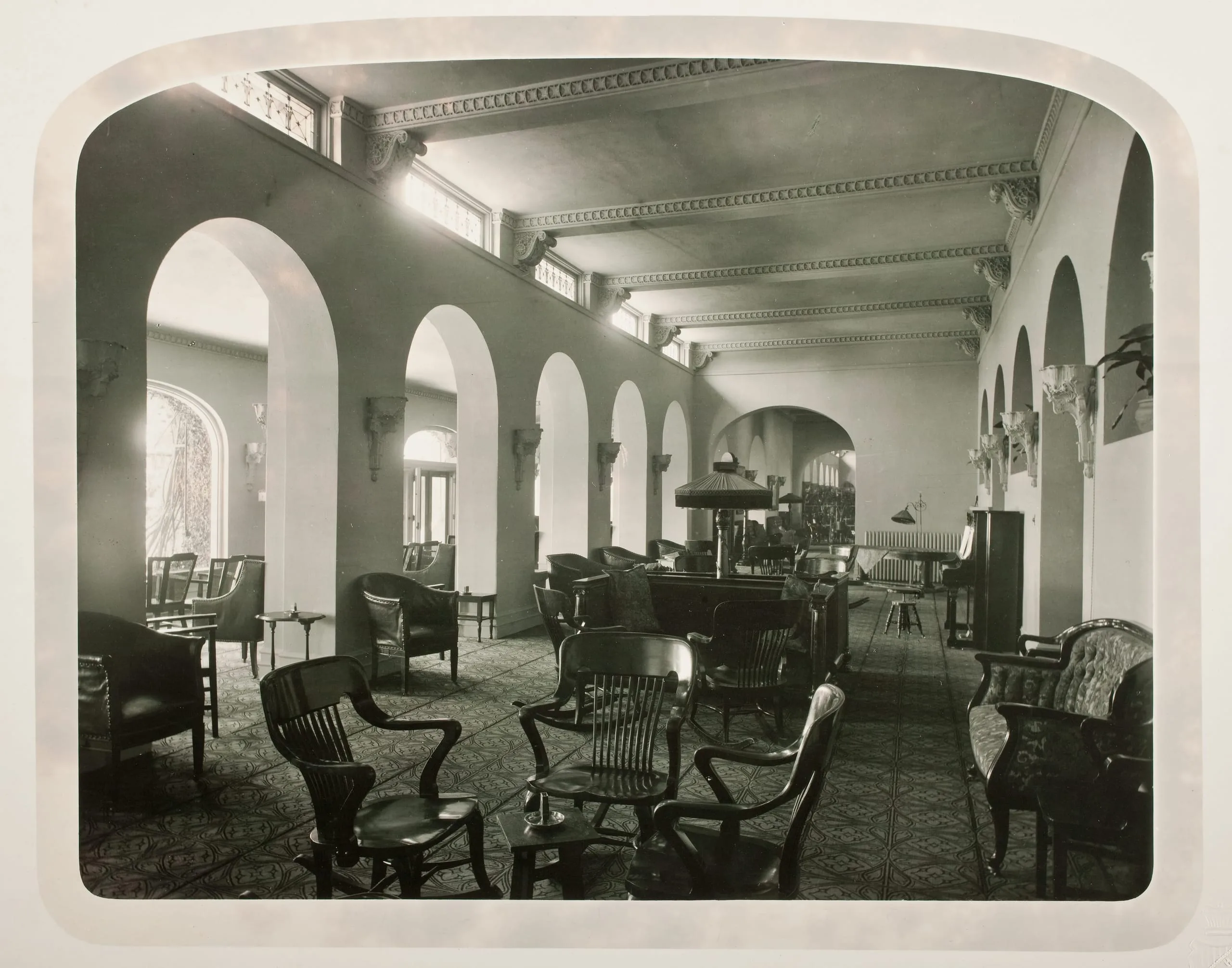Black and white photograph of a long, arched interior room furnished with dark wood spindle-back chairs, upholstered armchairs, and small tables, with clerestory windows and ornate ceiling molding