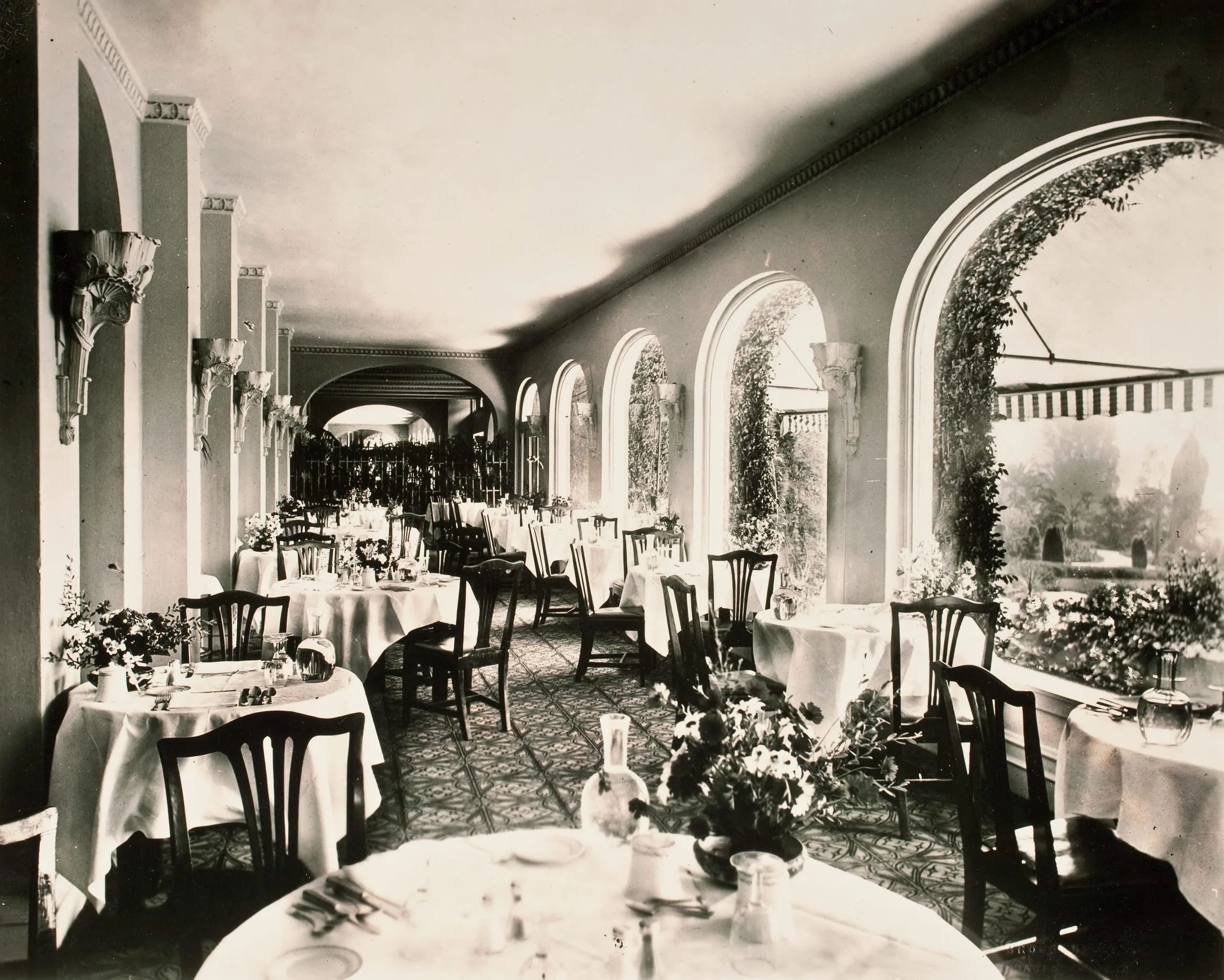 Sepia-toned photograph of an empty formal dining room with white-draped tables, dark wood chairs, arched windows overlooking a garden, and ornate wall sconces