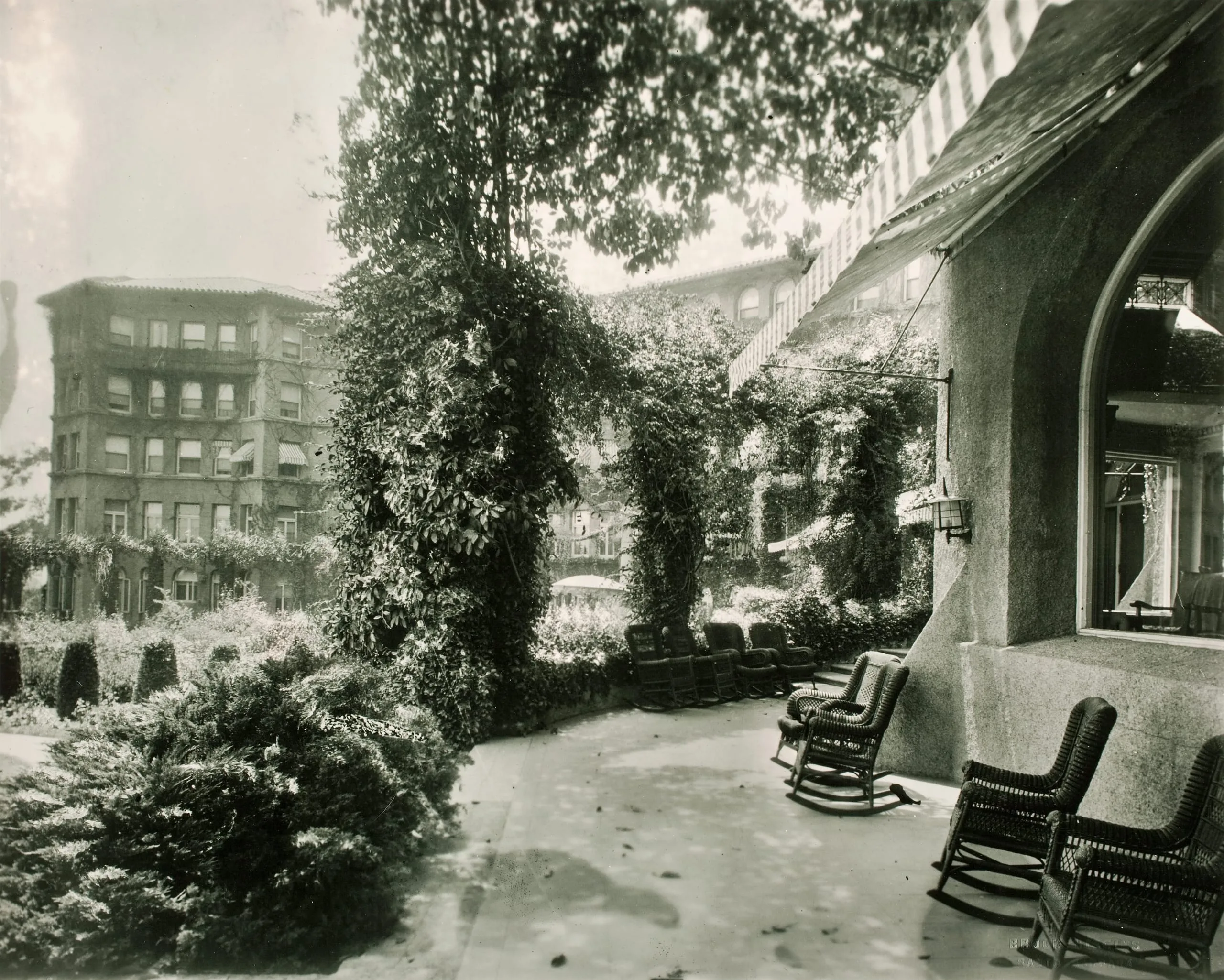 Sepia-toned photograph of a shaded outdoor terrace with wicker rocking chairs, climbing vines on trellises, and multi-story urban buildings in the distance