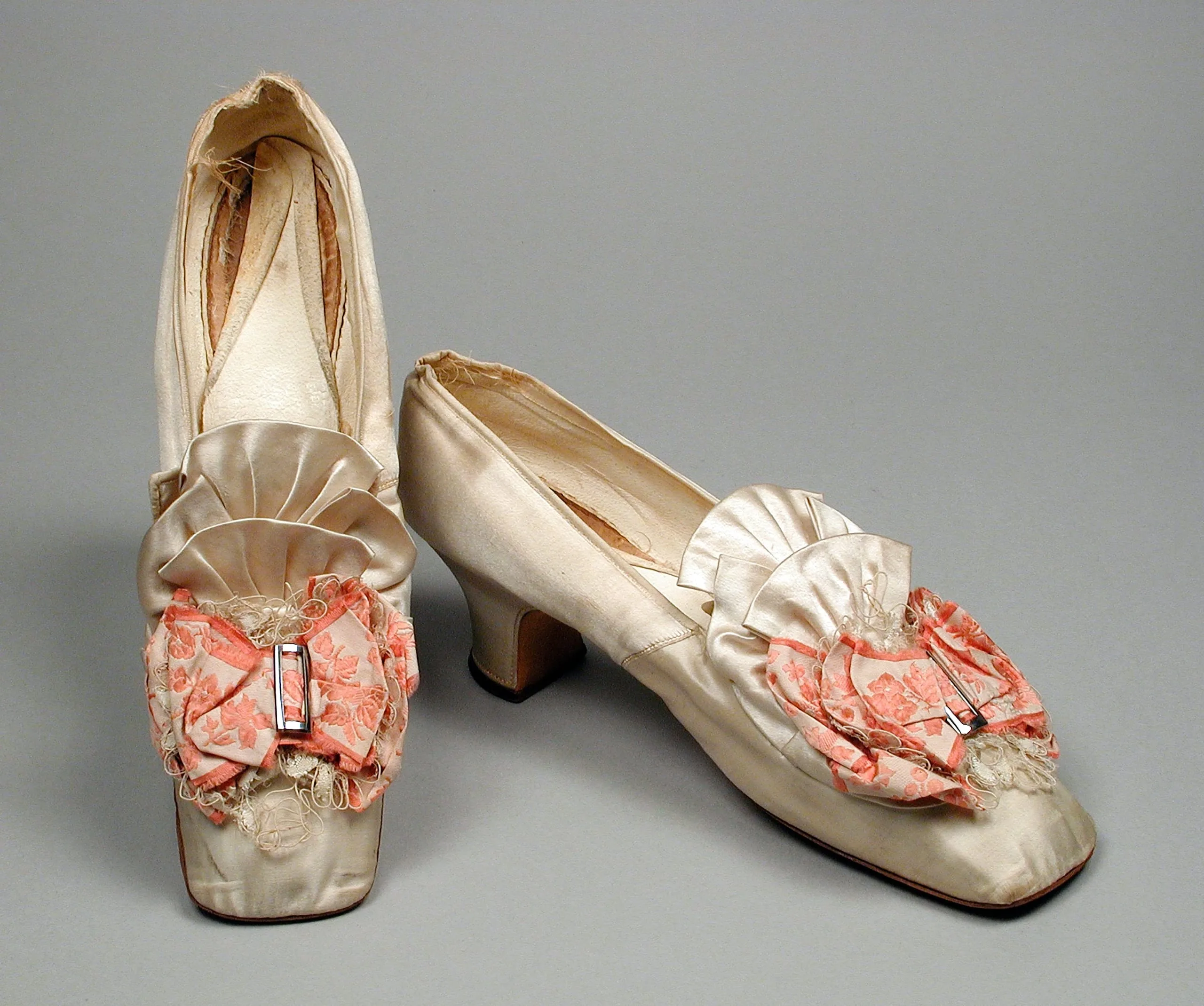 - Silk satin with silk plain weave ribbon with supplementary weft patterning, silk lace, metal buckles, and leather