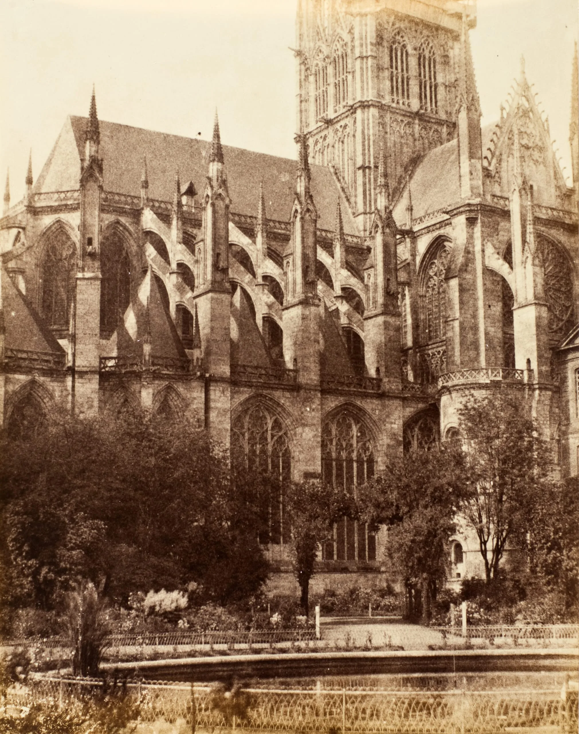 Alfred Capel-Cure approached his subject—the Church of St. Ouen de Rouen in France—with a photographic clarity that captured every detail of the architecture. He framed the church to show the facade as it would be seen from ground level by slicing off the top of the nearest spire. By not including the entire structure, Capel-Cure emphasized the viewer's experience of standing in front of the church.