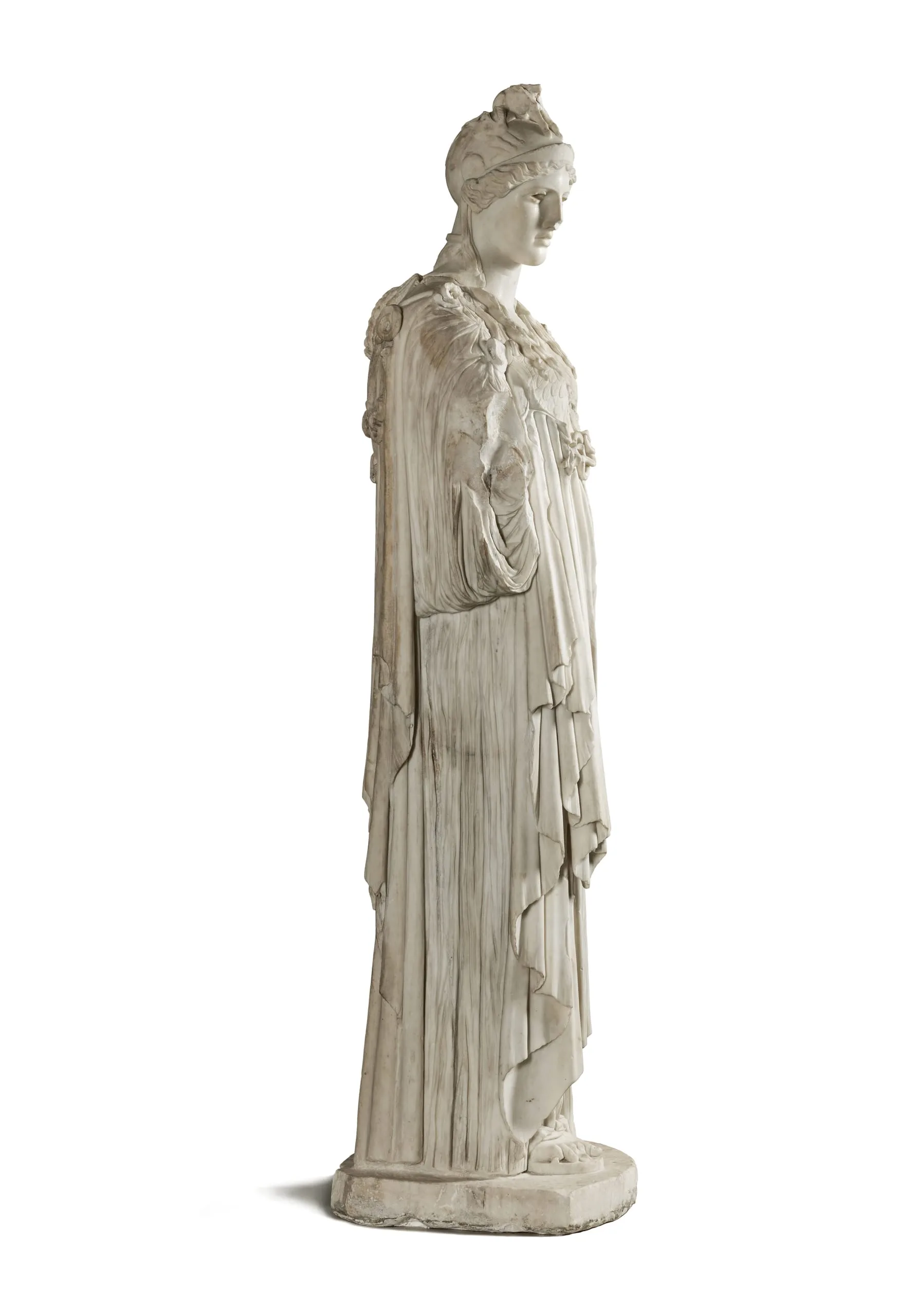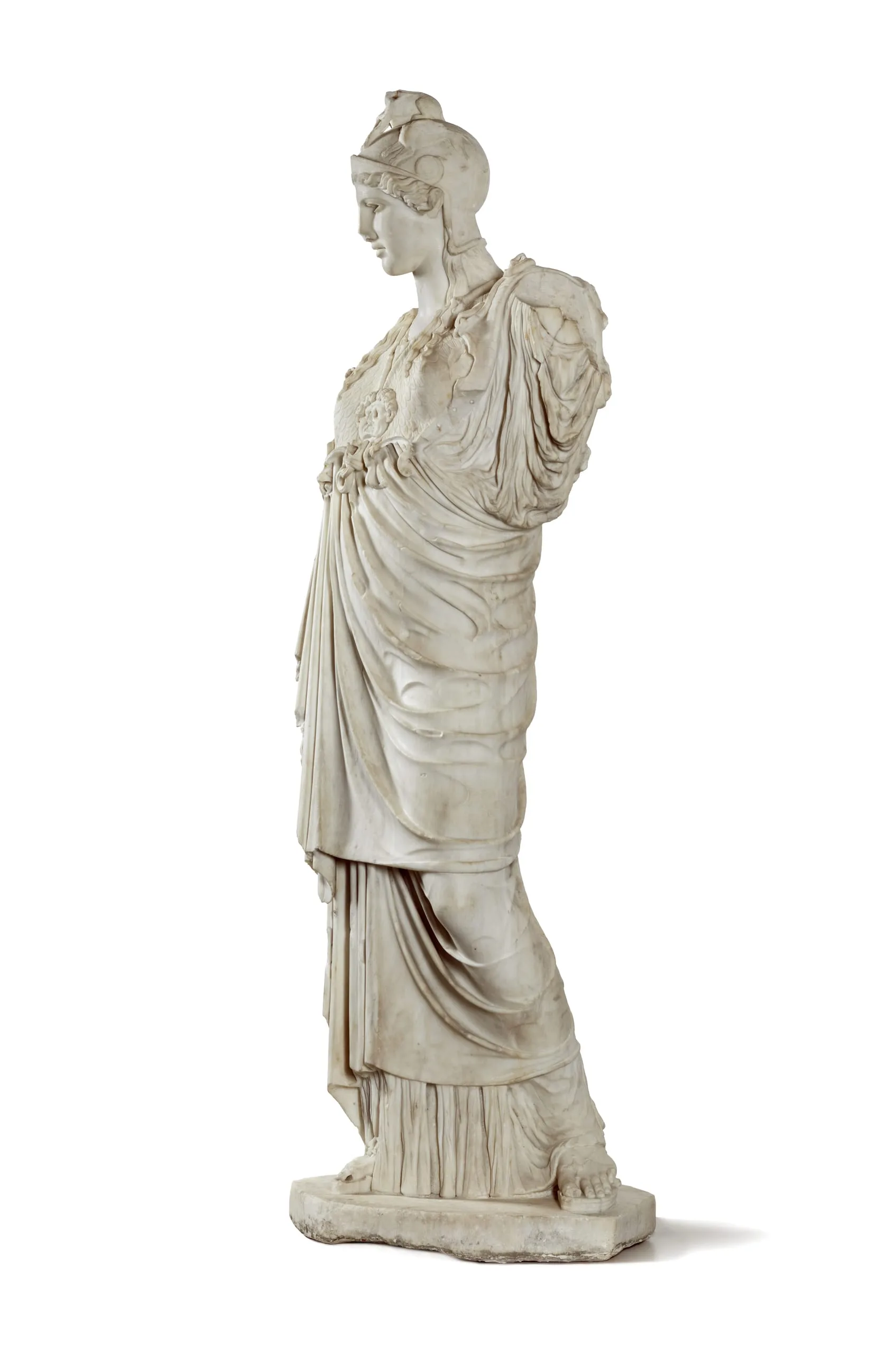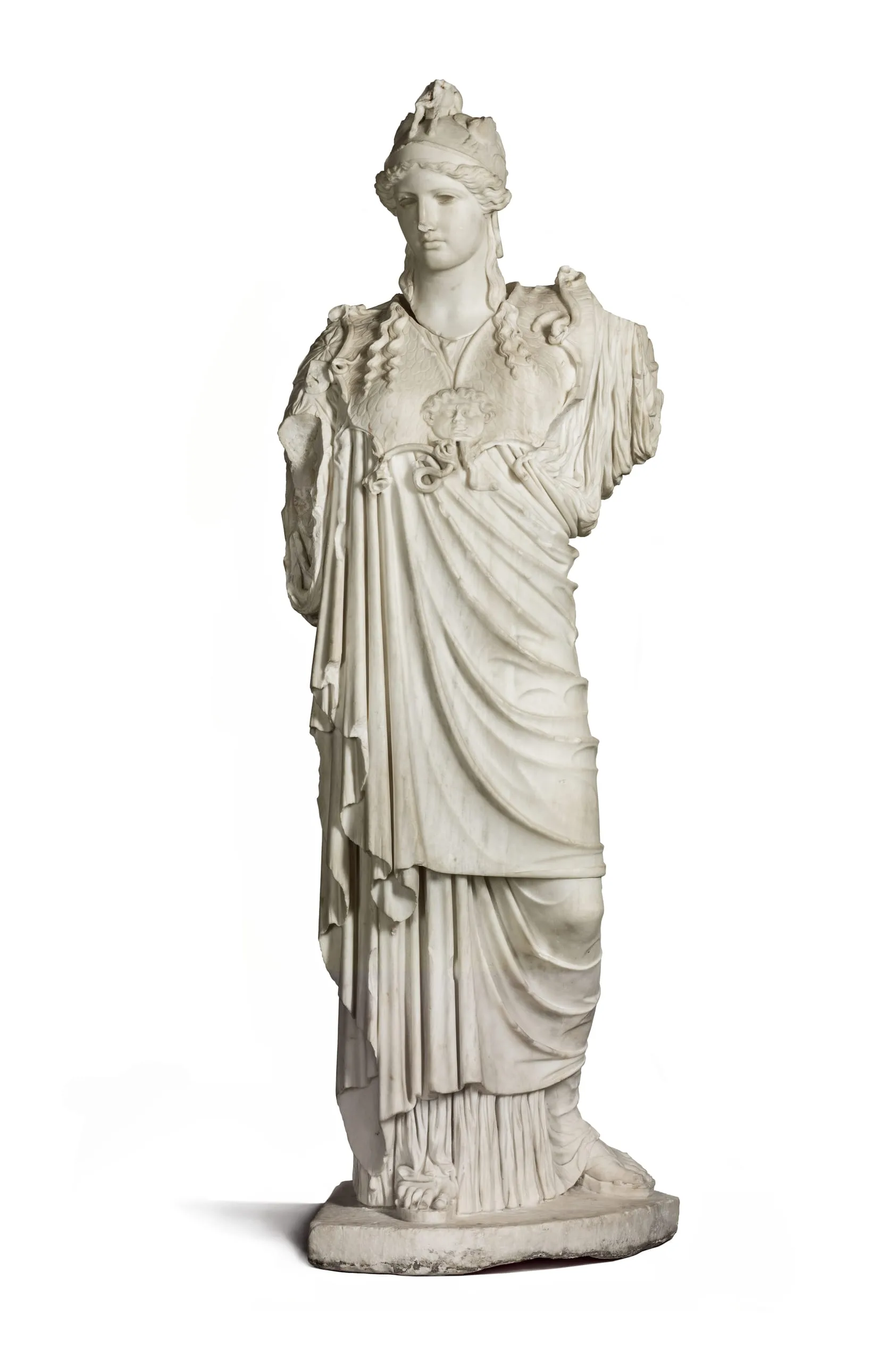 Marble sculpture of a standing female figure in three-quarter view, wearing a crested helmet, draped chiton and himation with an aegis at the chest, with finely carved drapery folds, on a rectangular plinth.