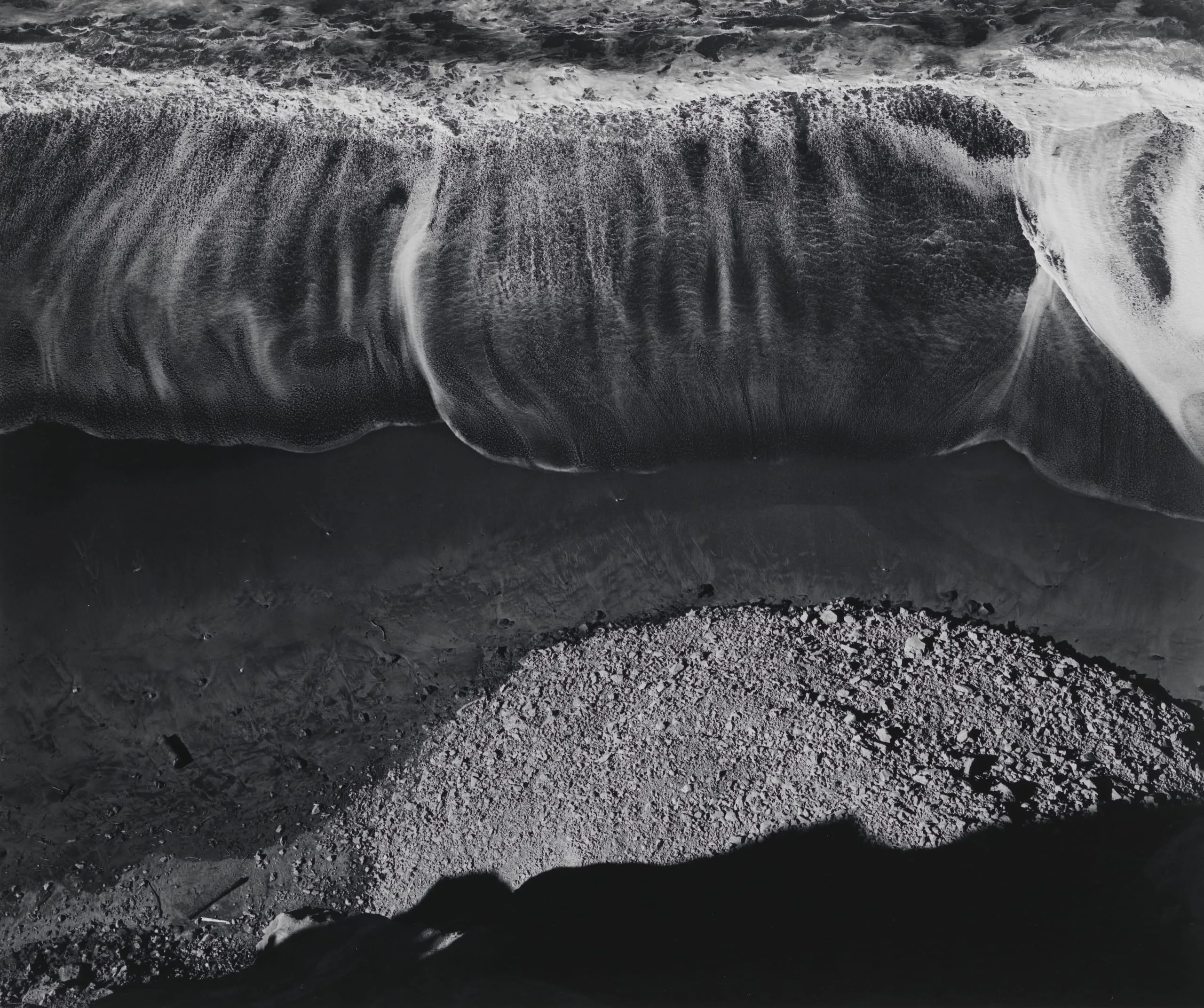 Black and white aerial photograph of a breaking ocean wave, with streaking water patterns on wet sand above a pebble-covered shoreline