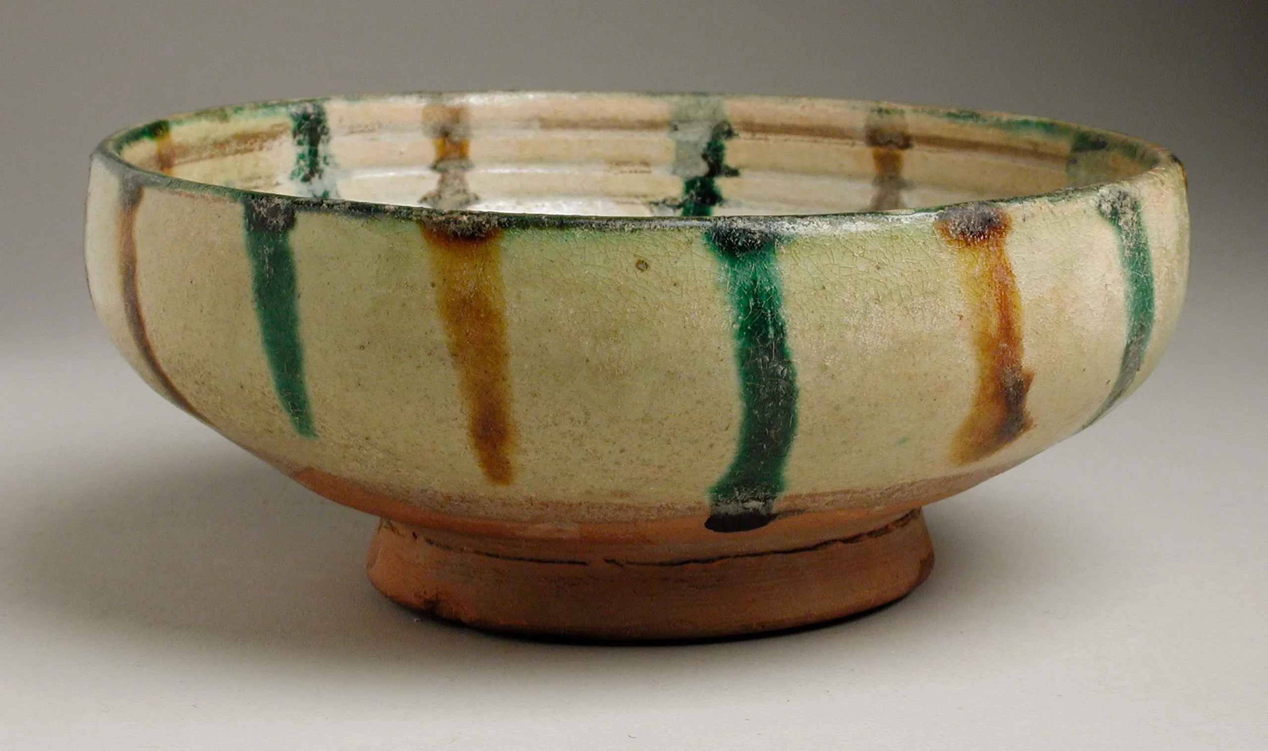 Ceramic bowl with cream glaze and vertical drip stripes in teal green, amber brown, and near-black, set on an unglazed terracotta foot ring