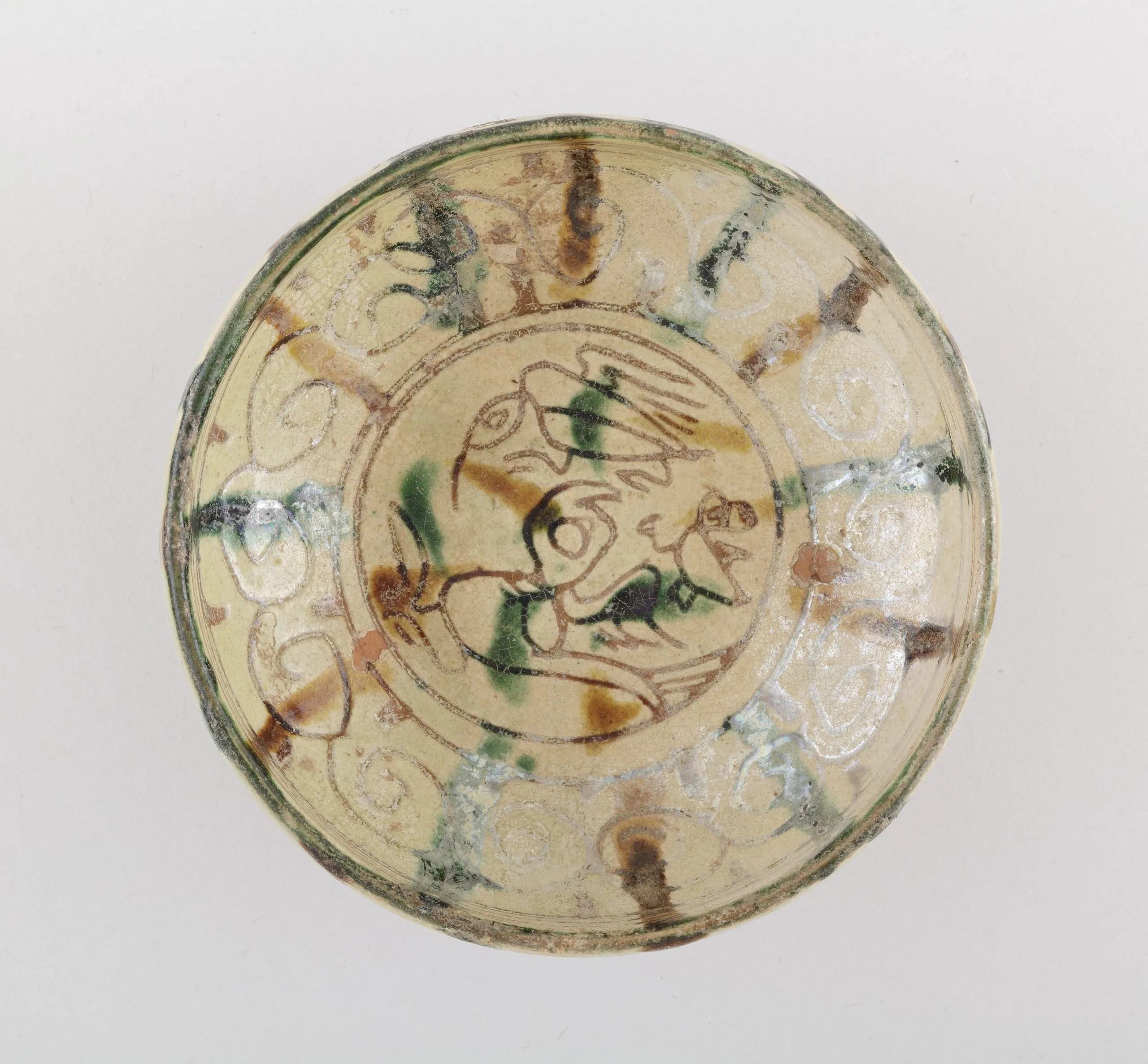 Ceramic bowl viewed from above, with cream ground and painted decoration in green, brown, and black; a bird in profile at the center medallion, surrounded by scrolling vegetal motifs on the sloping sides, with iridescent surface from age.