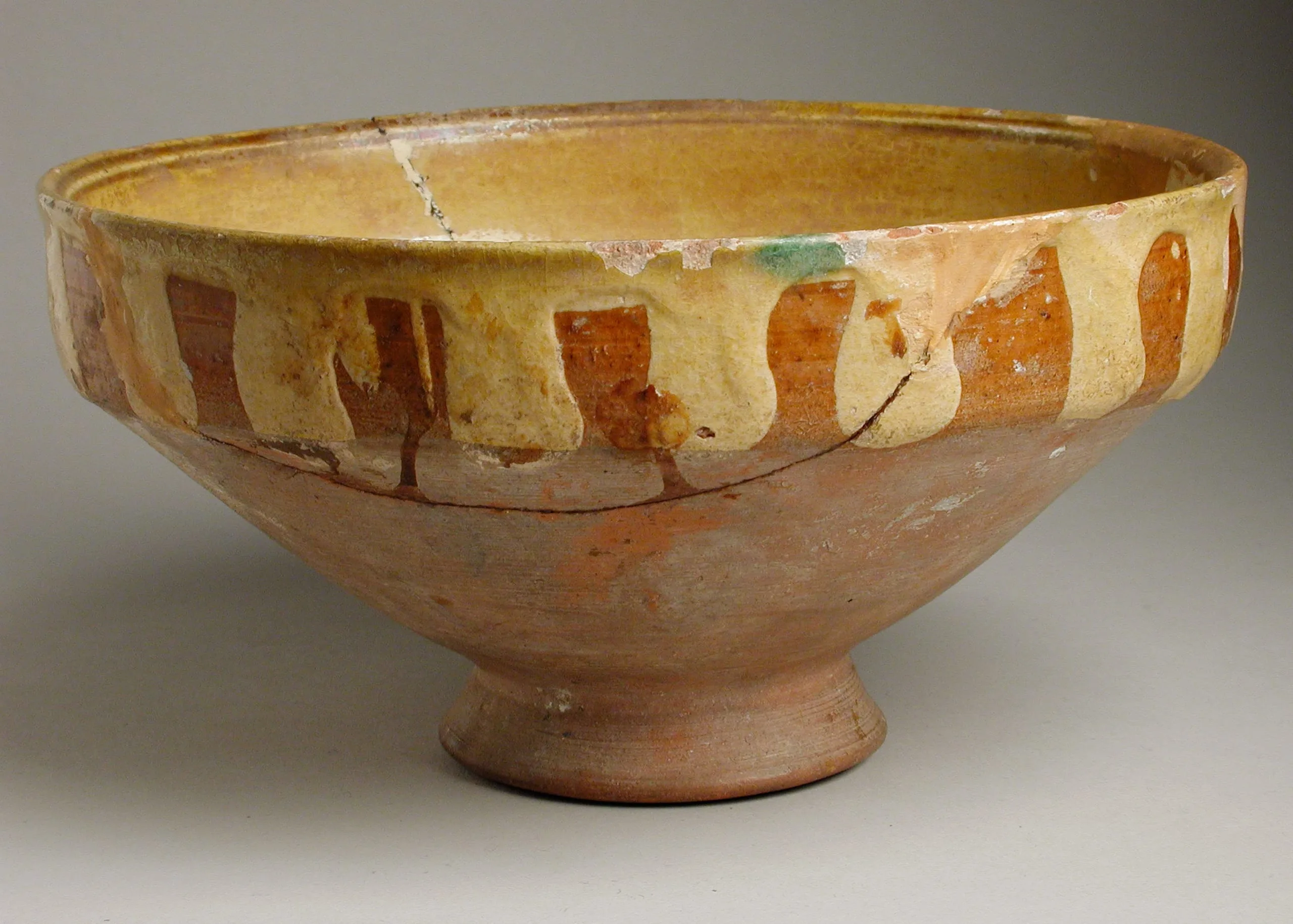 Ceramic footed bowl with terracotta body, pale yellow interior glaze, and a band of amber and cream painted decoration below the rim