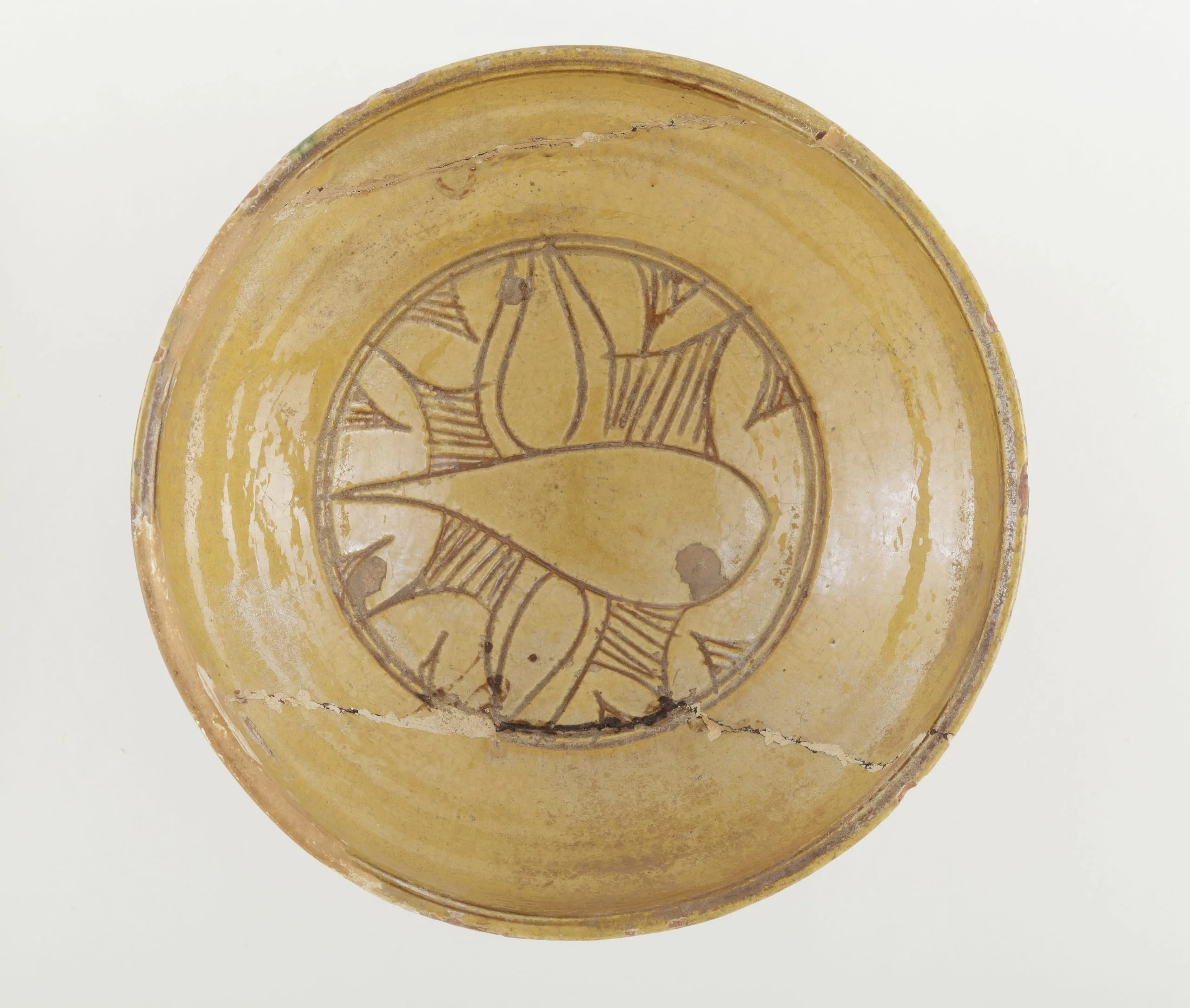 Ceramic bowl with pale yellow glaze, viewed from above, featuring a painted bird with spread wings within a circular medallion at the center, executed in brown brushwork with hatched feather details; a repaired crack visible across the lower half.