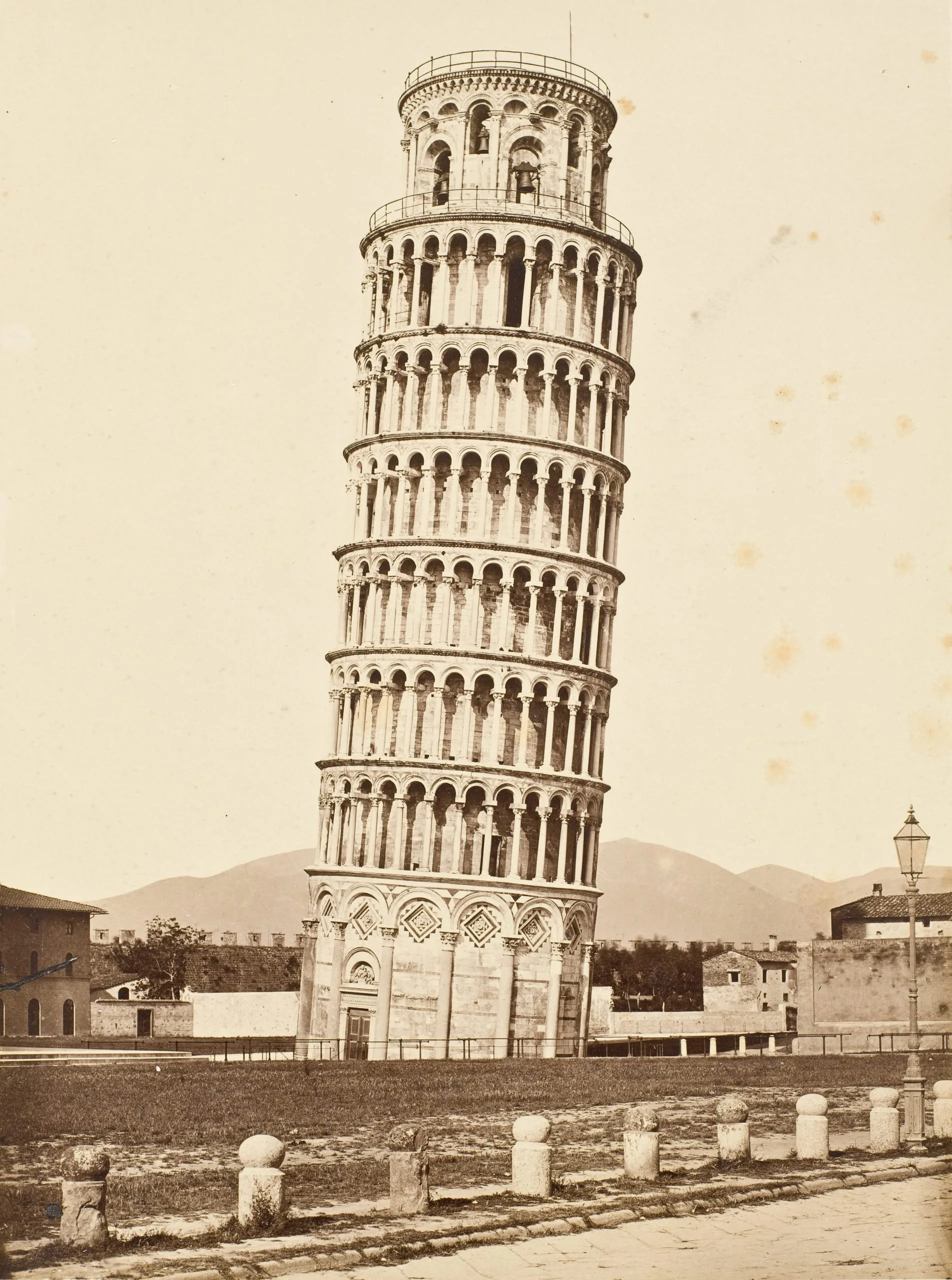 The Alinari Brothers documented the Leaning Tower of Pisa in its entirety, presenting architectural detail, the strange tilt, and the context of the city and landscape. The glass negative captured fine detail and, combined with the flattened tonality of the albumen paper, created almost an outline of the tower. No people can be seen, suggesting that the photograph was taken in the early morning before Pisa's pedestrian traffic began.