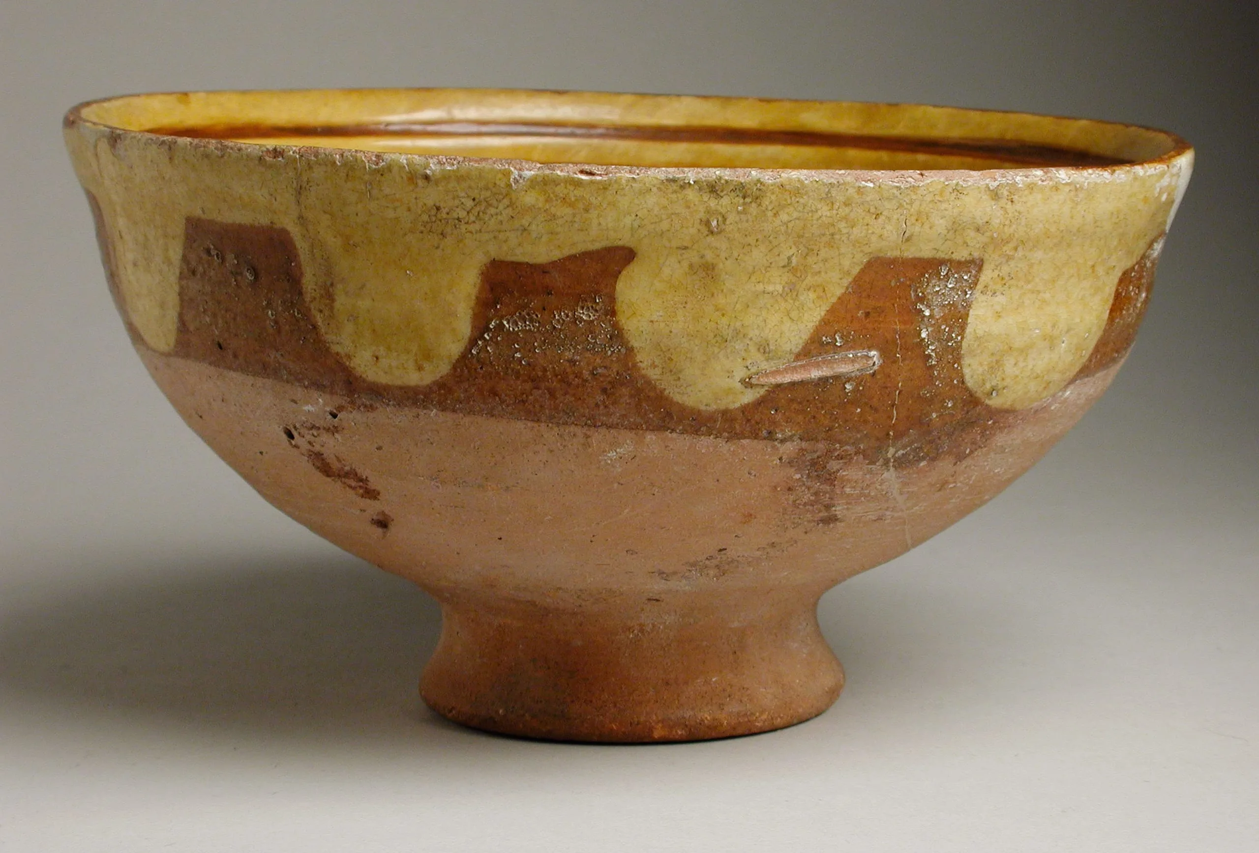 Earthenware bowl with rounded body and narrow foot, upper half glazed in pale yellow-green over amber-brown clay, interior glazed in deep amber-orange