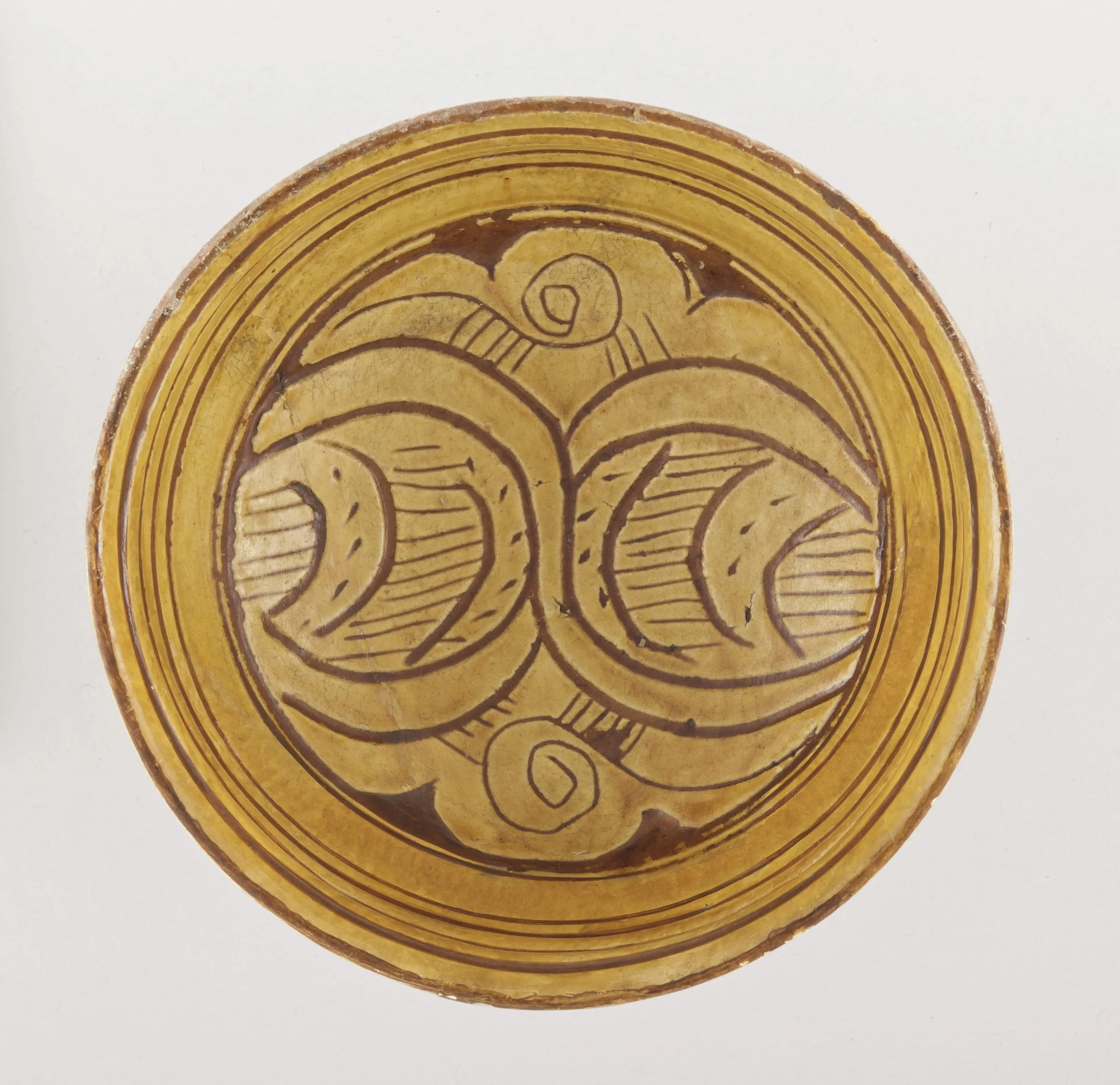 Ceramic dish with amber-yellow glaze, viewed from above, featuring a sgraffito design of two mirrored fish with hatched line detailing at center, framed by scrolling foliate forms and concentric rings at the rim.