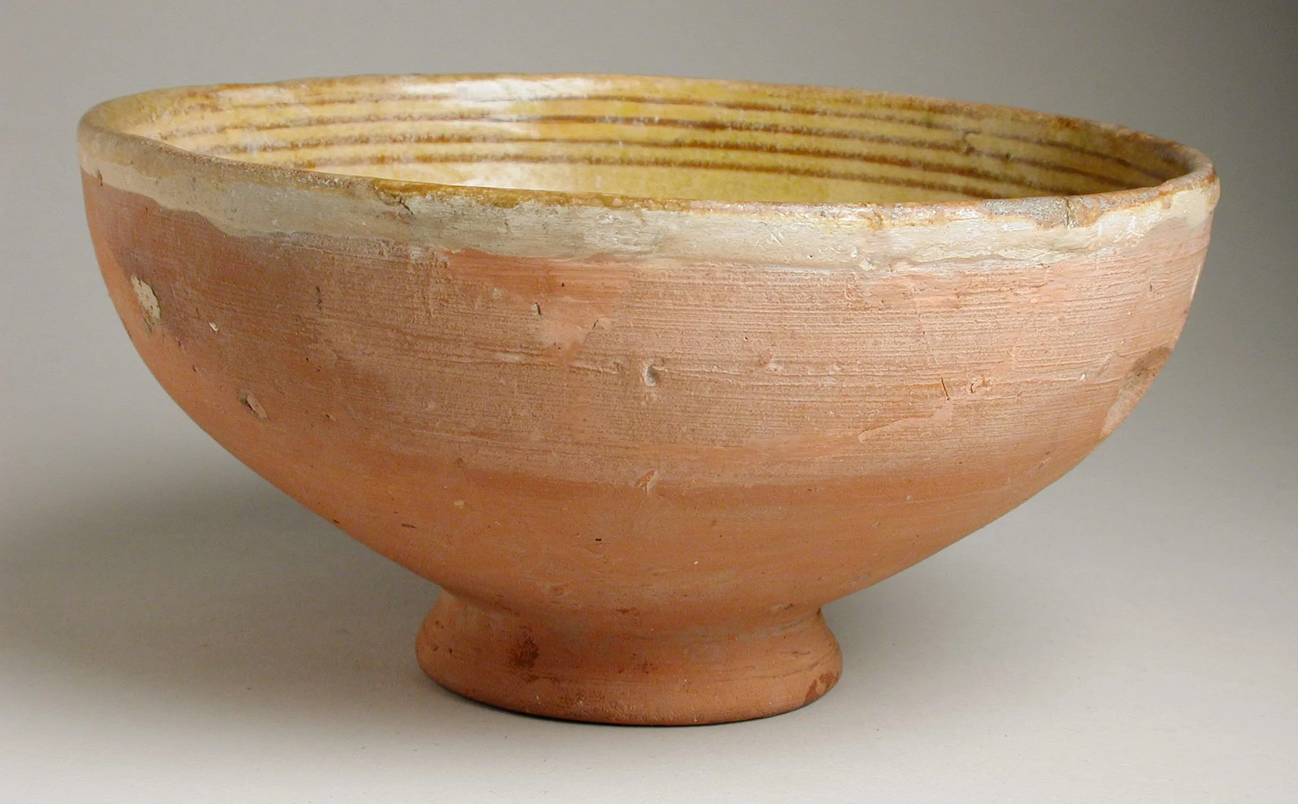 Wheel-thrown terracotta bowl with salmon-pink unglazed exterior, white slip band near the rim, and a pale yellow glazed interior with concentric amber rings
