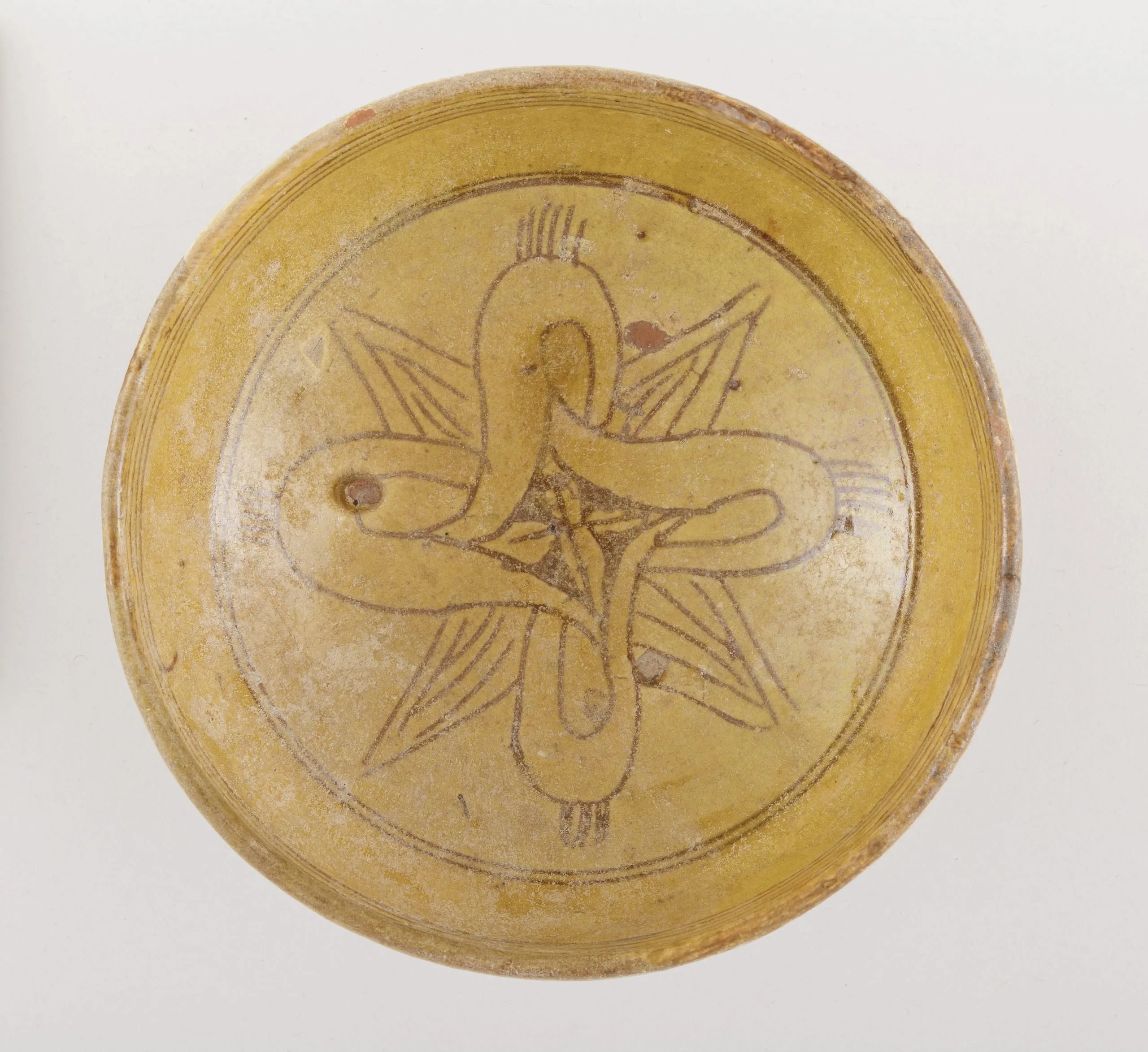 Ceramic bowl with yellow glaze, viewed from above, decorated with a painted bird figure at center surrounded by radiating pointed leaf or flame motifs, rendered in dark brown brushwork on a pale yellow ground.