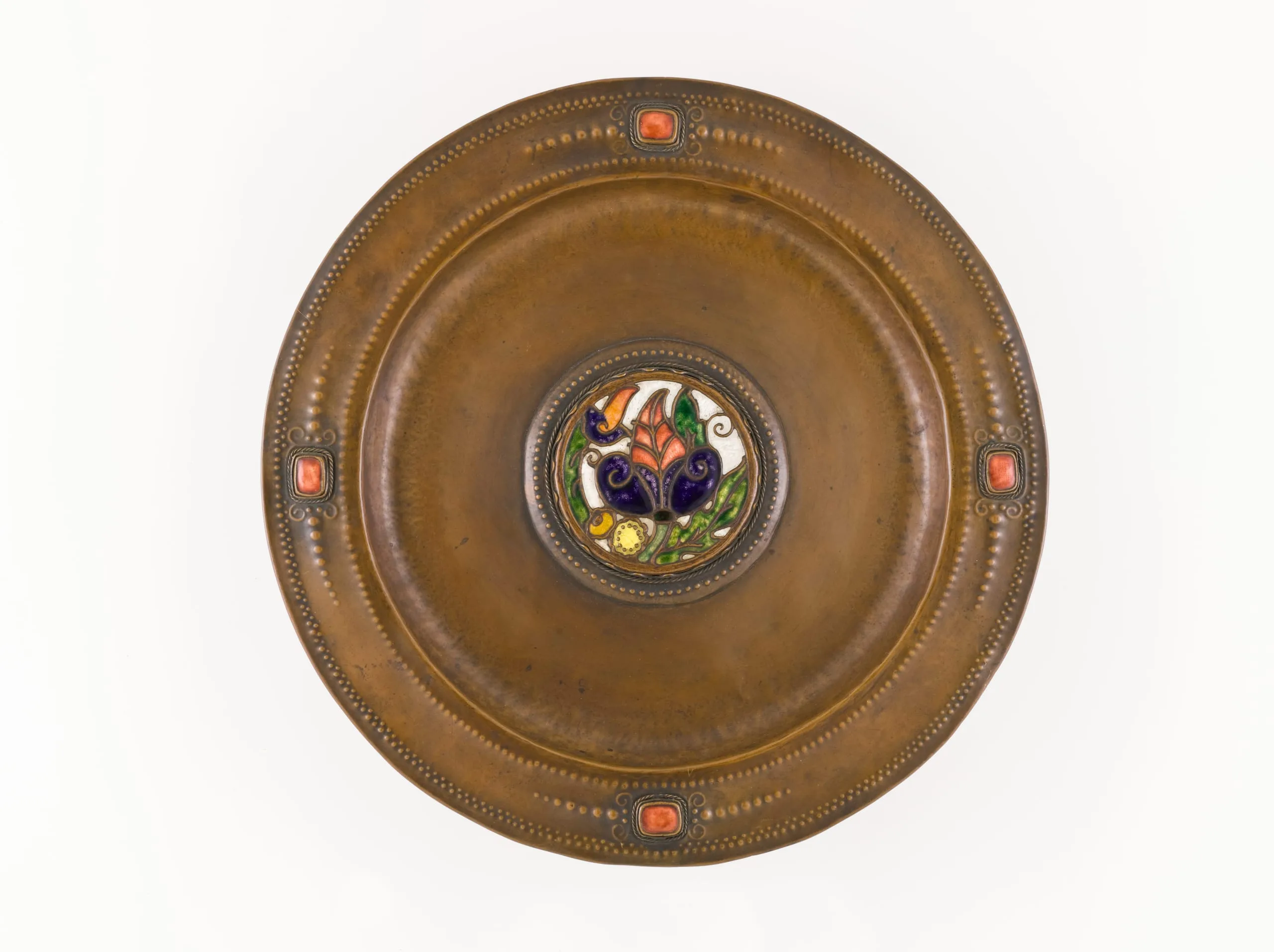 Douglas Donaldson was a leading figure of the Arts and Crafts movement in Southern California. After early studies in Joliet, Illinois, he studied and taught classes in jewelry and metalwork at the Handicraft Guild of Minneapolis from about 1907 to 1909. Donaldson moved to Pasadena, where in 1912, he was named head of the art department at the Manual Arts High School in Los Angeles, and in 1919 he joined the faculty of Otis Art Institute. He also opened a summer school with courses in decorative design and color theory. Throughout the 1910s, Donaldson exhibited jewelry, hammered copper vessels, and enamels at exhibitions in Minneapolis, Chicago, and Boston. He and his wife, Louise (who had also studied and taught at the Handicraft Guild), selected and installed the display of applied arts by Southern California artists at the Panama-California Exposition in San Diego (1915), where an enameled and jeweled silver-gilt chalice by Donaldson received a gold medal. This charger represents Donaldson at the height of his artistic abilities, with its elaborate repoussé beading, scrolled cabochons set with semi-precious stones, and central medallion of cloisonné enamel. It also represents the lasting impact of British Arts and Crafts traditions across the United States.
