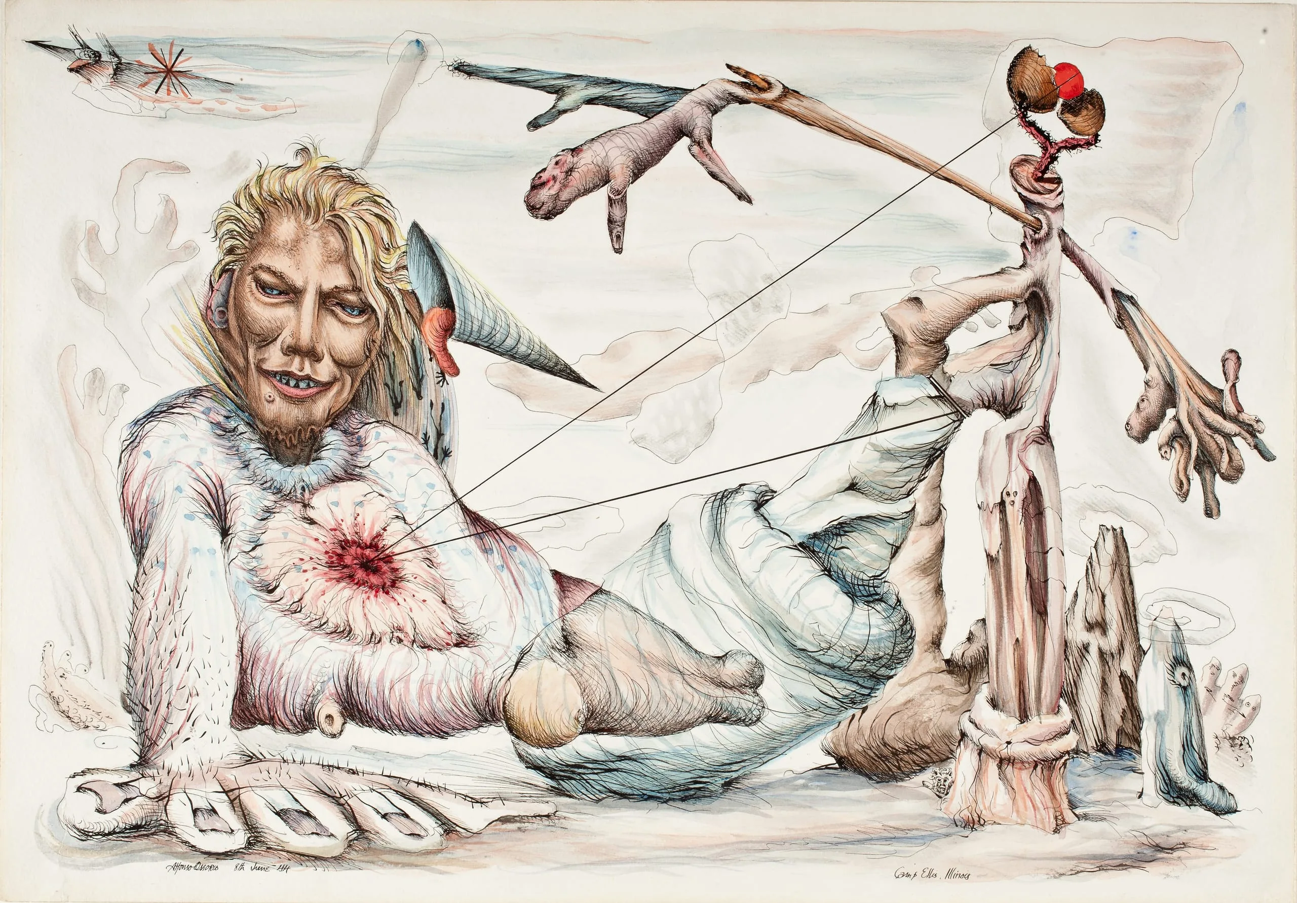 - Ink and watercolor on paper