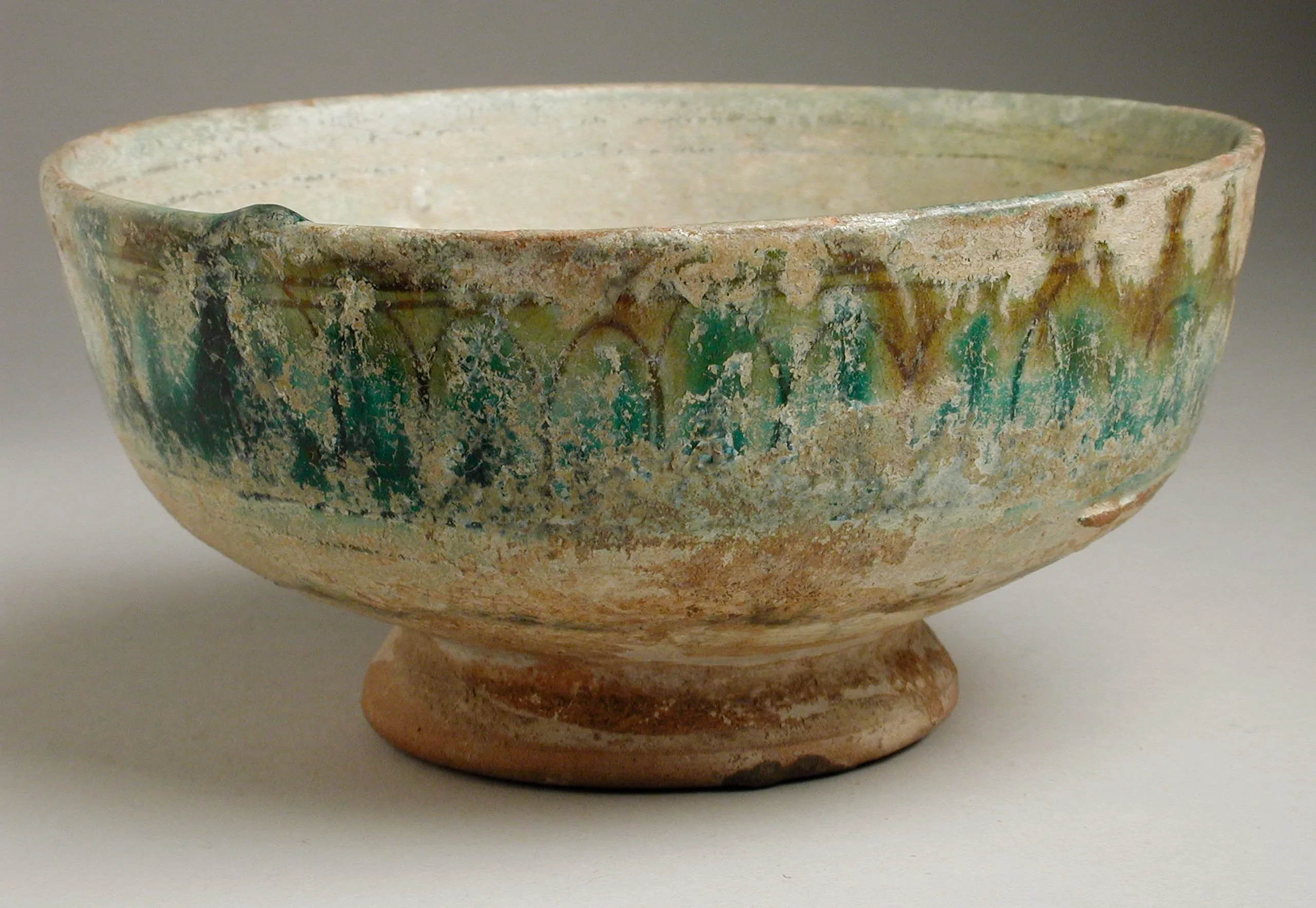 Ceramic bowl with wide rounded body on a short foot ring, decorated with a teal and olive-green chevron band, glaze heavily degraded to a chalky white crust