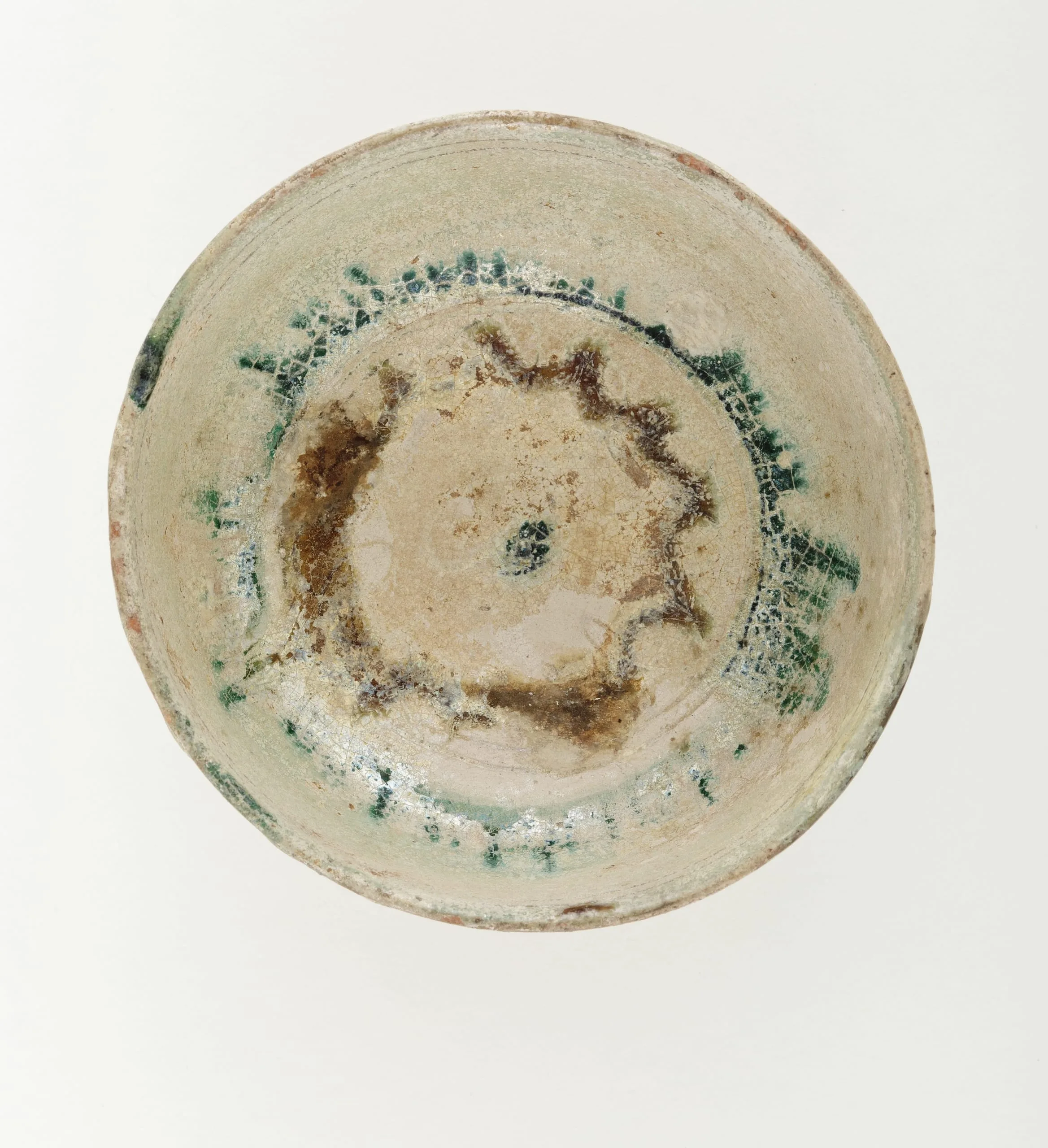 Ceramic bowl viewed from above, with a cream-colored glaze and a band of green spotted decoration near the rim; the central well shows heavy brown iridescent weathering and crackled surface.