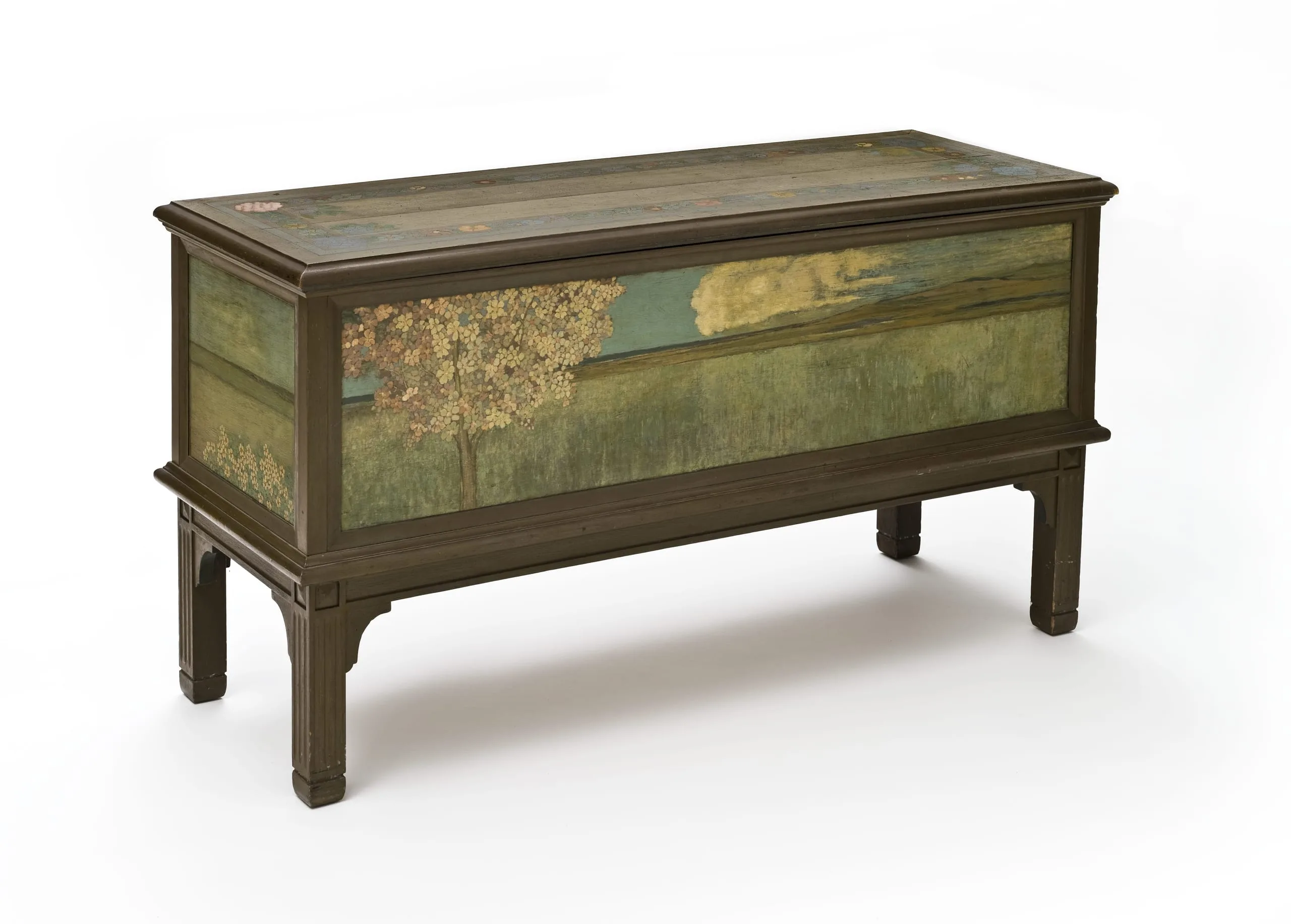Painters, furniture designers, carvers, and civic reformers, Arthur and Lucia Mathews were leaders of the Arts and Crafts movement in northern California. Arthur Mathews apprenticed as an architect before spending several years traveling and receiving classical art training at the Academie Julian in Paris. Upon his return to San Francisco in 1889, he worked as a muralist, painter, art educator, and director of the Mark Hopkins Institute of Art, where he met his wife, Lucia. Together they established the Furniture Shop in San Francisco, which provided custom furniture and interior designs. Their typical work would have been considered "artistic furniture," made with superior craftsmanship and small shop traditions, but in revival styles. This chest, however, is an example of a rare group of extraordinary carved and polychromed objects made for close friends, family, and for a few special commissions. These works are set in the California landscape—depicted as an unsullied, pre-industrial Eden—but recall the heritage of the Mediterranean world, uniting the ideals of the Arts and Crafts movement and the classicism of the American Renaissance. Arthur Mathews, working with a group of craftsmen, designed most of the furniture and decorative accessories; Lucia Mathews assisted with designing and supervised color choices and carving.